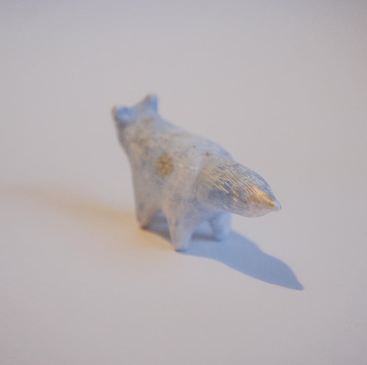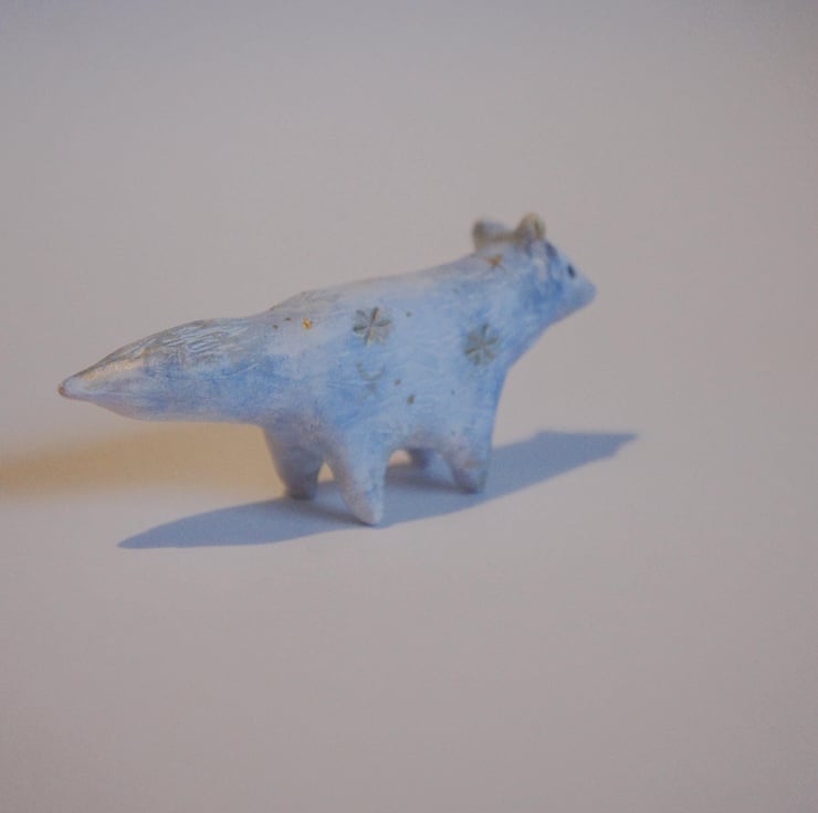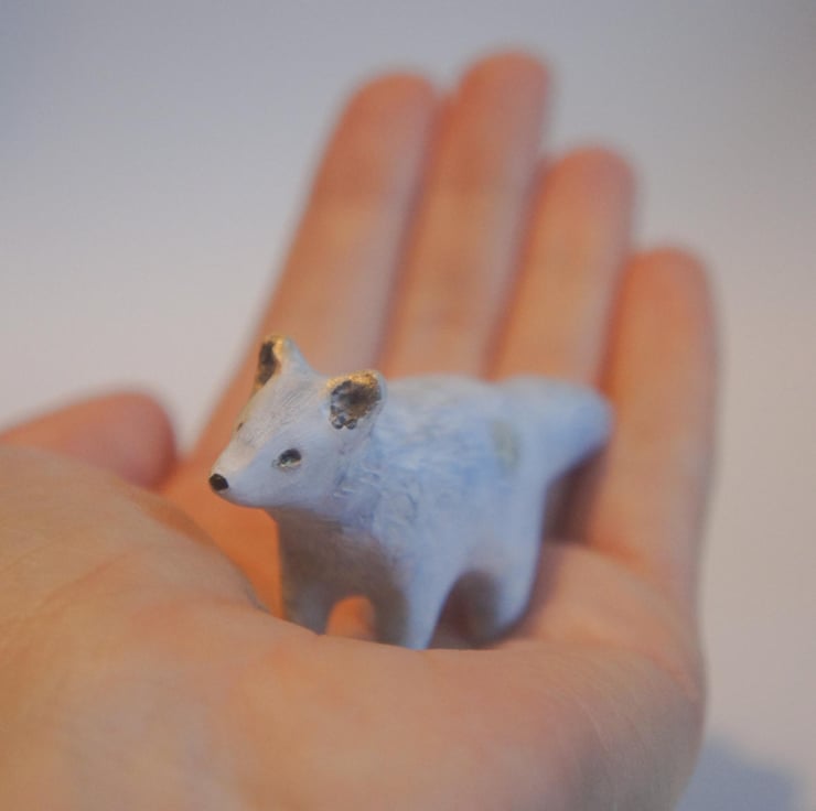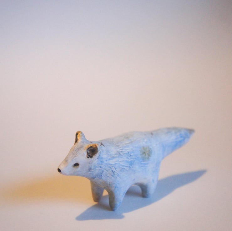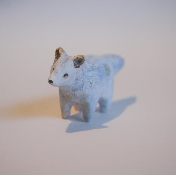A miniature hand sculpted Arctic fox sculpture. A one of a kind small sculpture, carefully sculpted from clay.