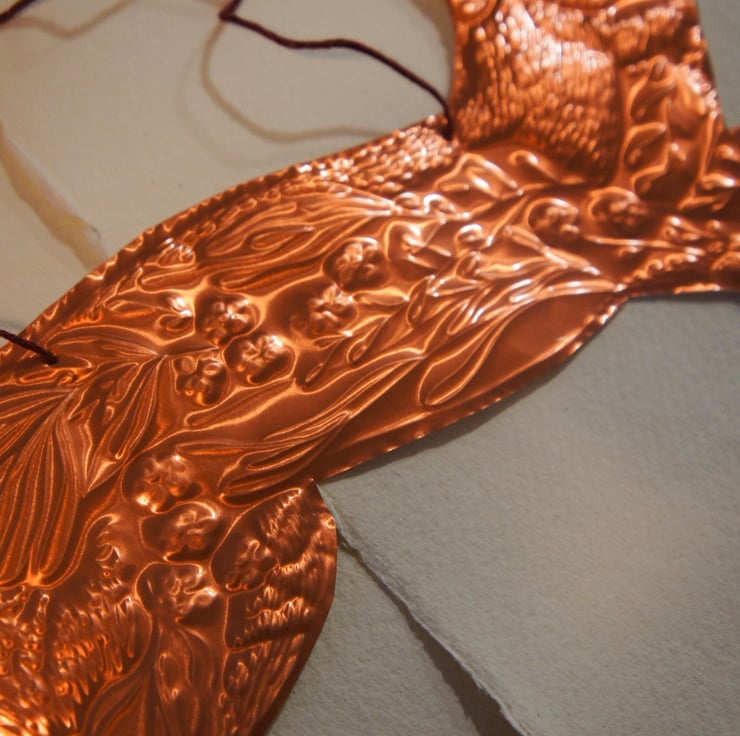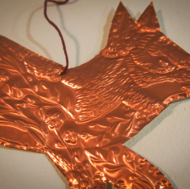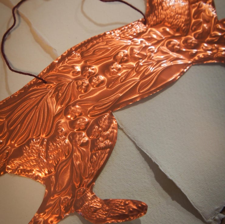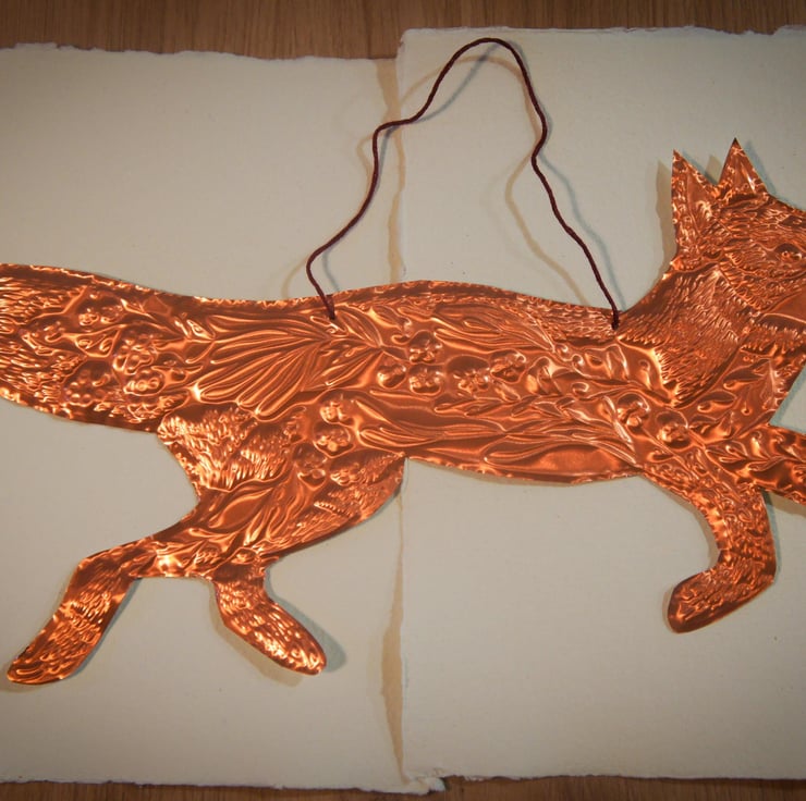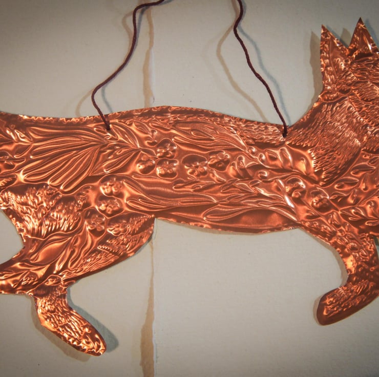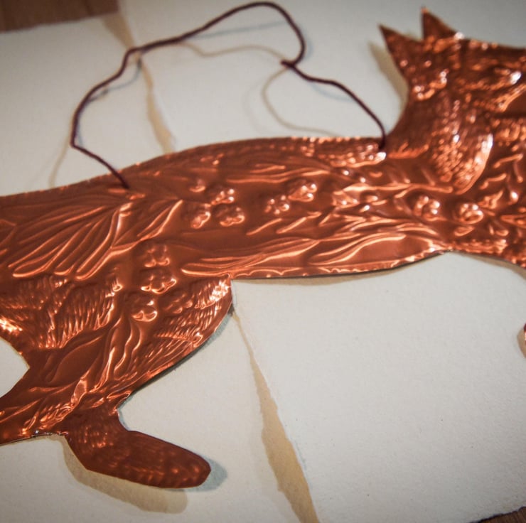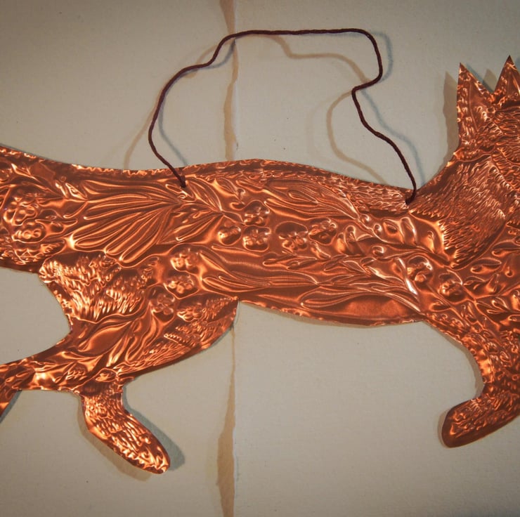 A handmade copper fox decoration. One of a kind embossed decoration depicting a fox with forget me not flower detail.