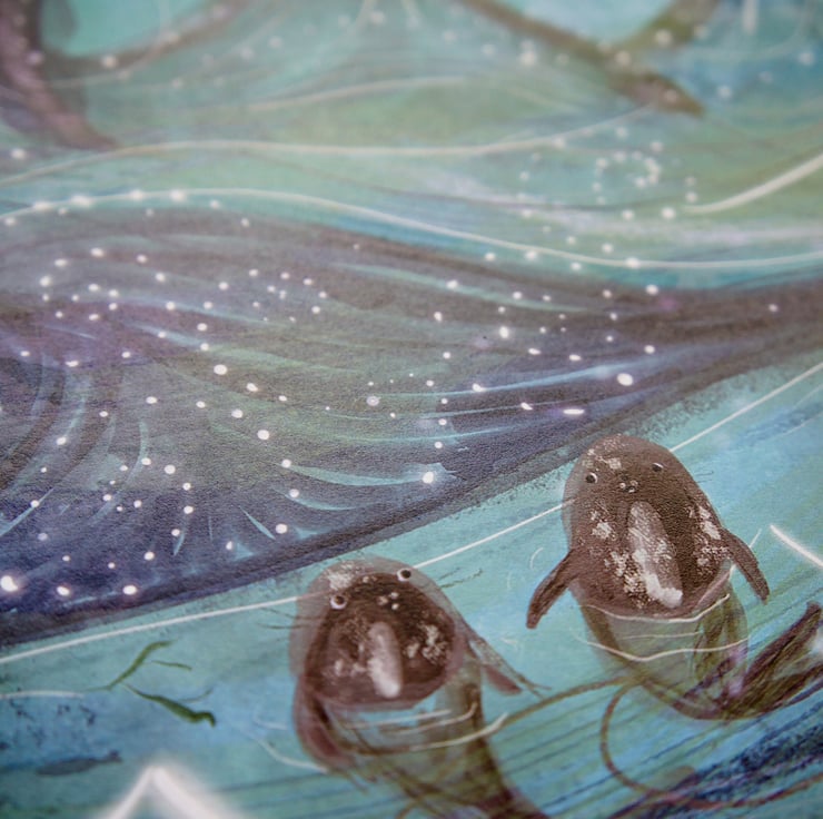 An A4 size art print of my original painting depicting a pair of seals, a magical bioluminescent sea and a brightly glowing full moon.
