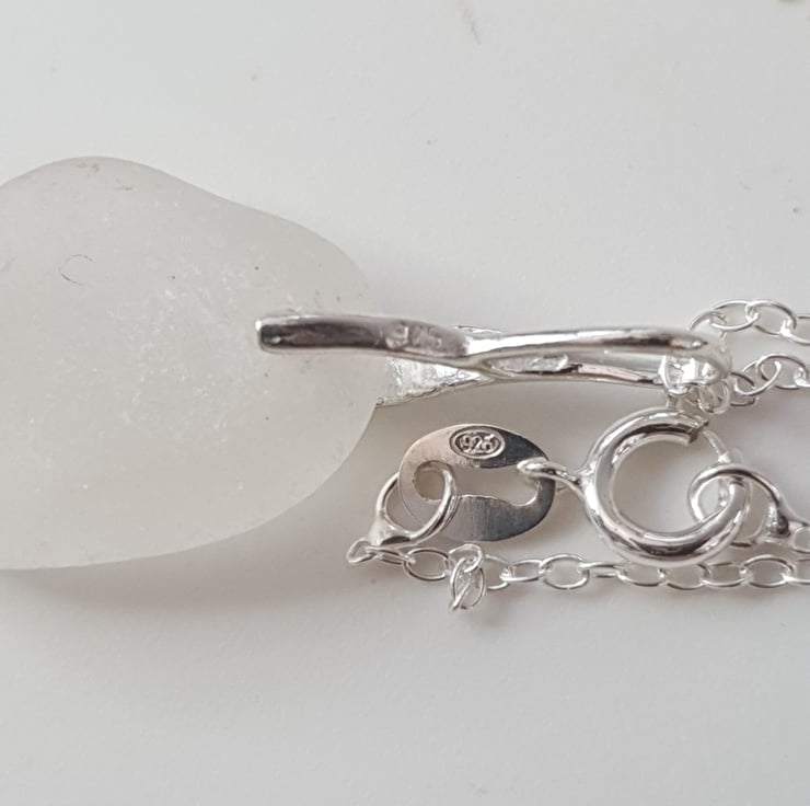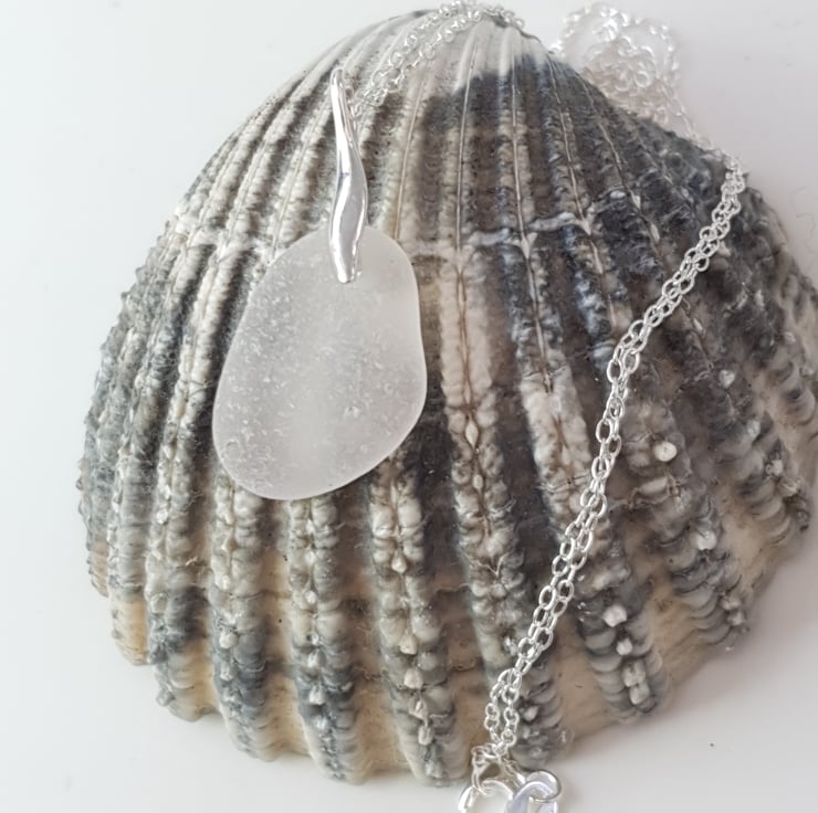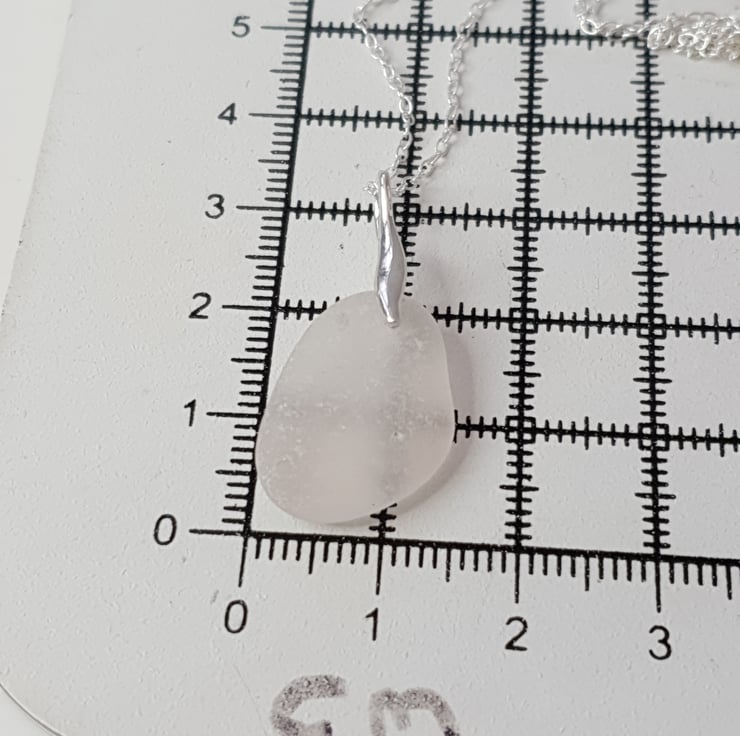 A simple white sea glass pendant on an 18 inch Sterling Silver chain.