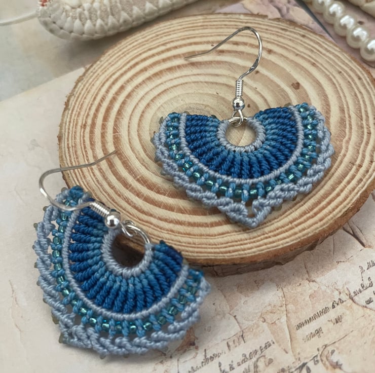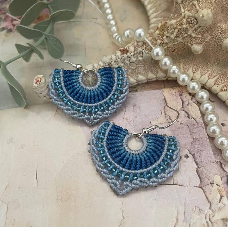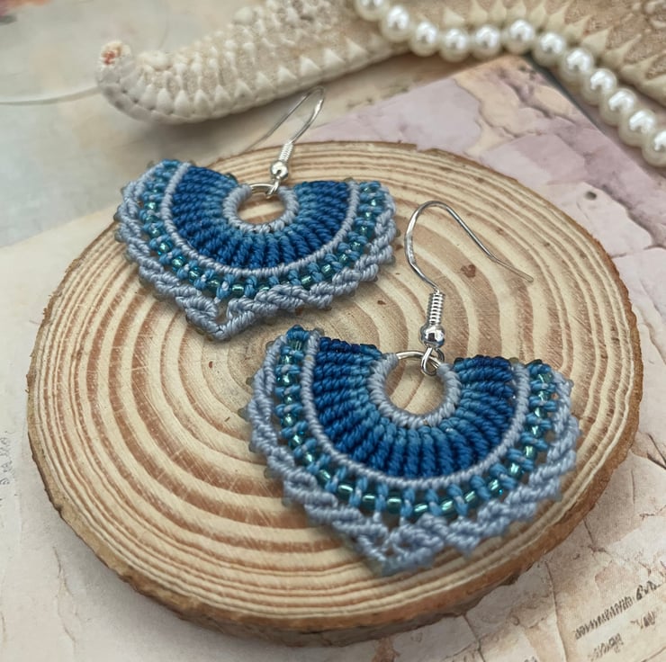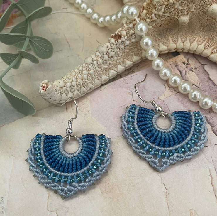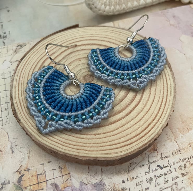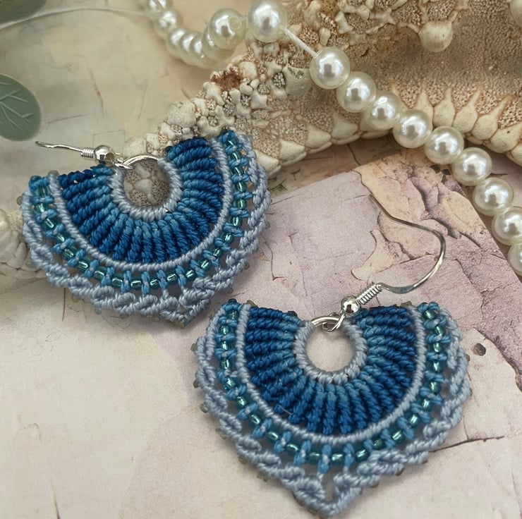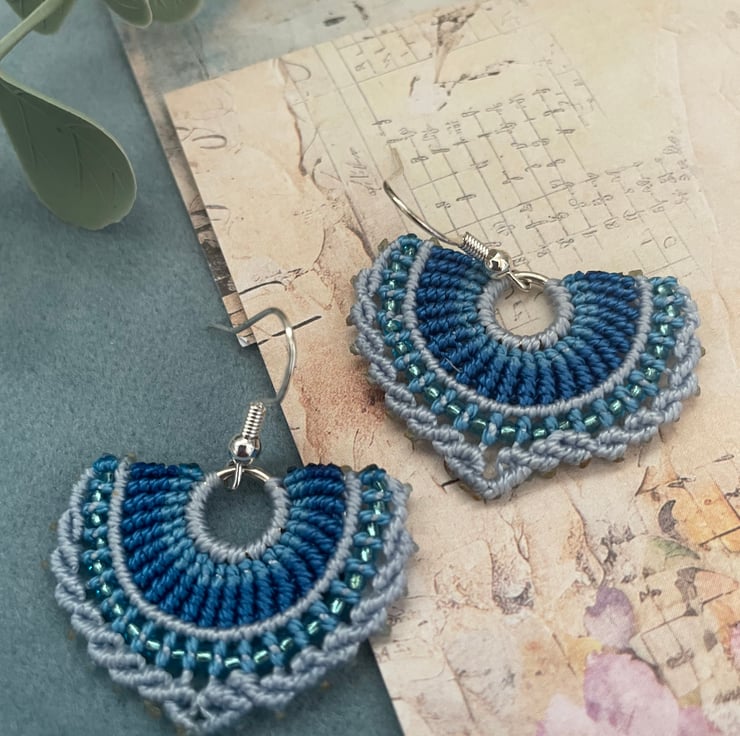 Designed and created by me in my Kent studio in pretty shades of blue interwoven with tiny glass seed beads and using unbreakable c-lon macrame thread which makes them very light weight but makes a big statement .