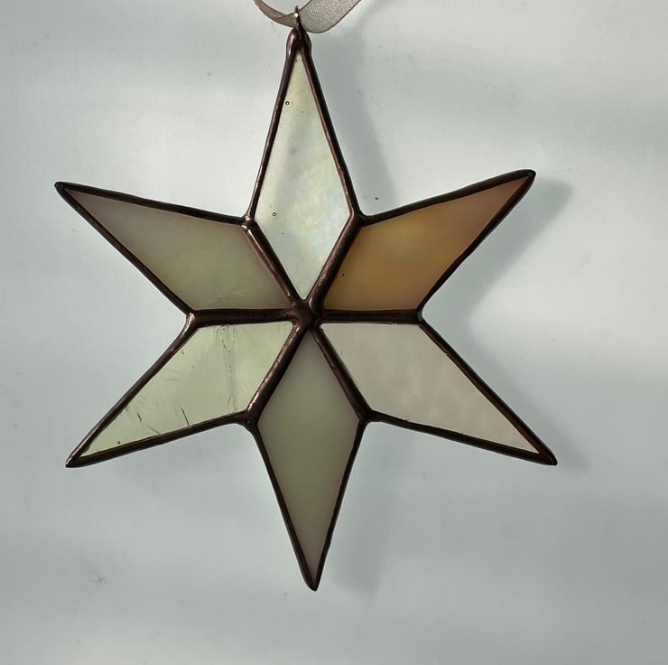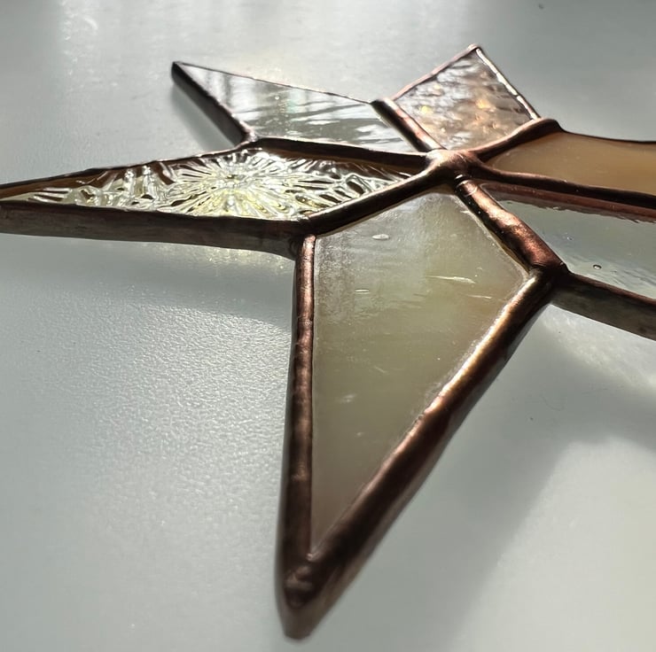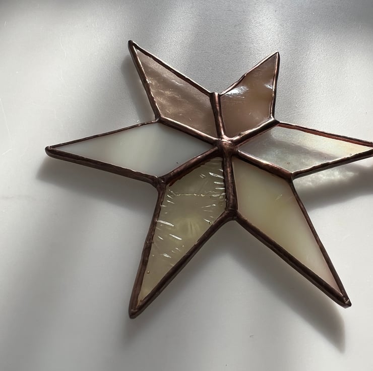 Pretty stained glass star. Of the hundred or so stars made, these are my favourite colours. Finished with a copper patina.