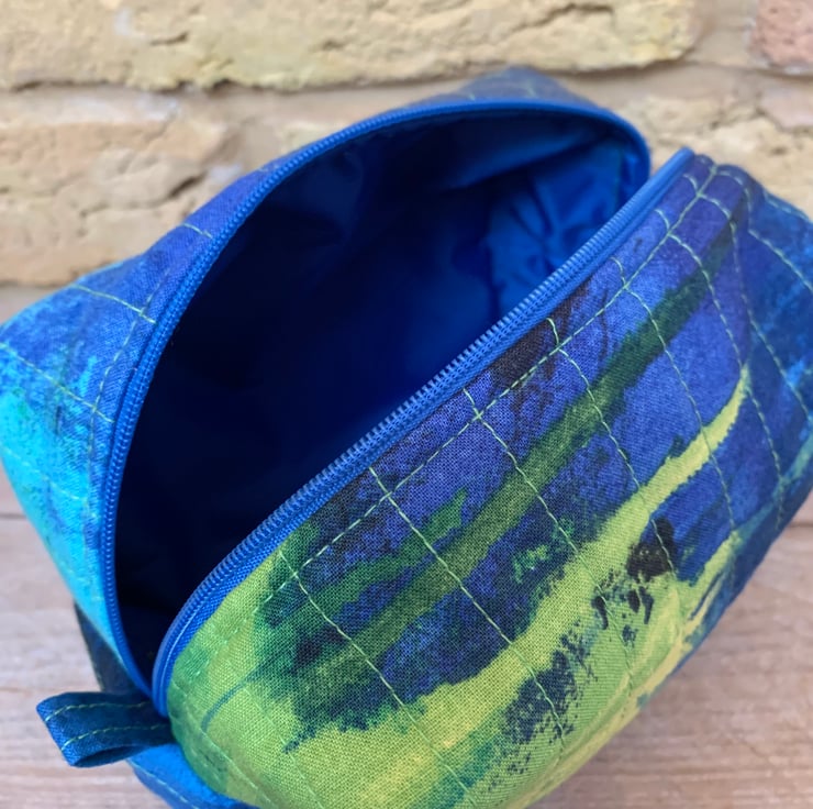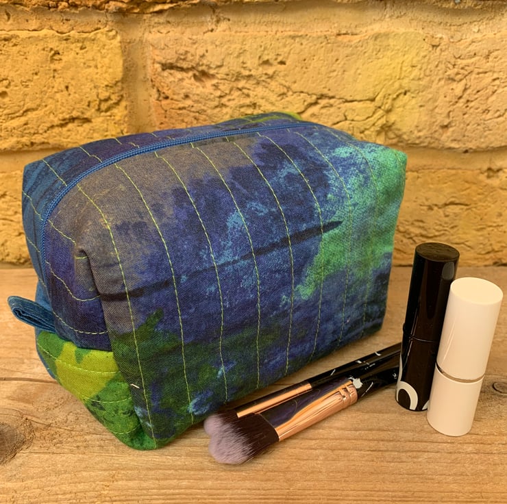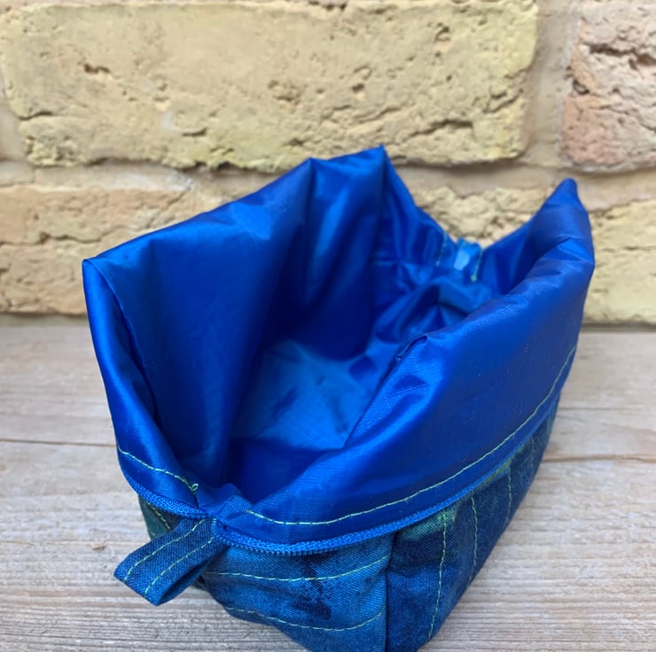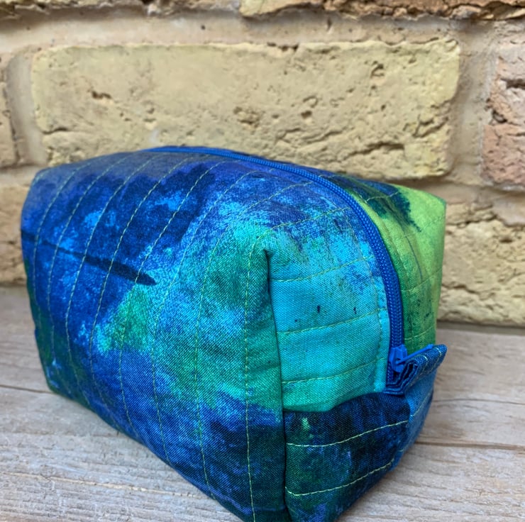 The box shape makeup bag is made with this lovely blue and green cotton fabric.
