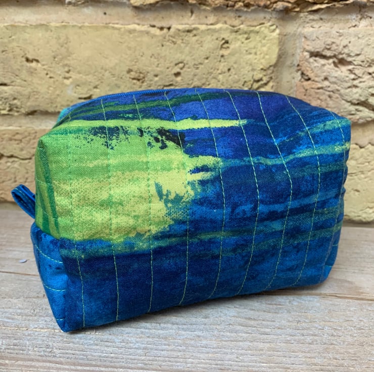 Blue and Green Quilted Fabric Box Shape Makeup Bag