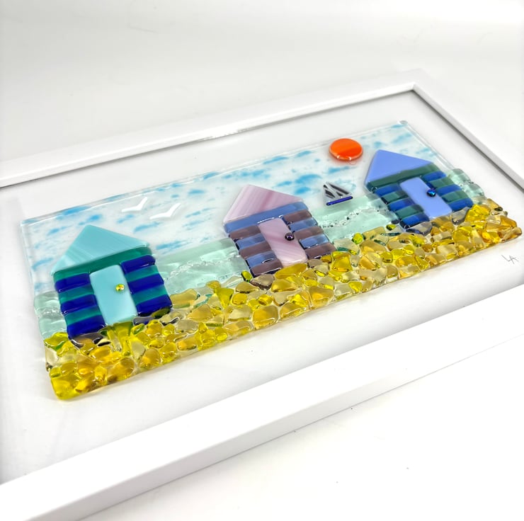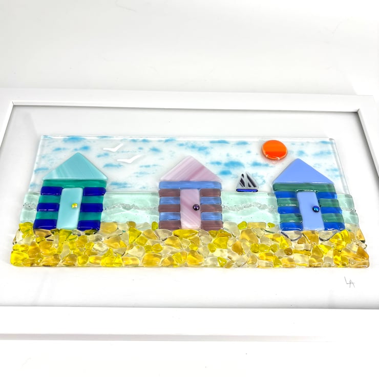 The glass is mounted in a white frame and is ready to hang.