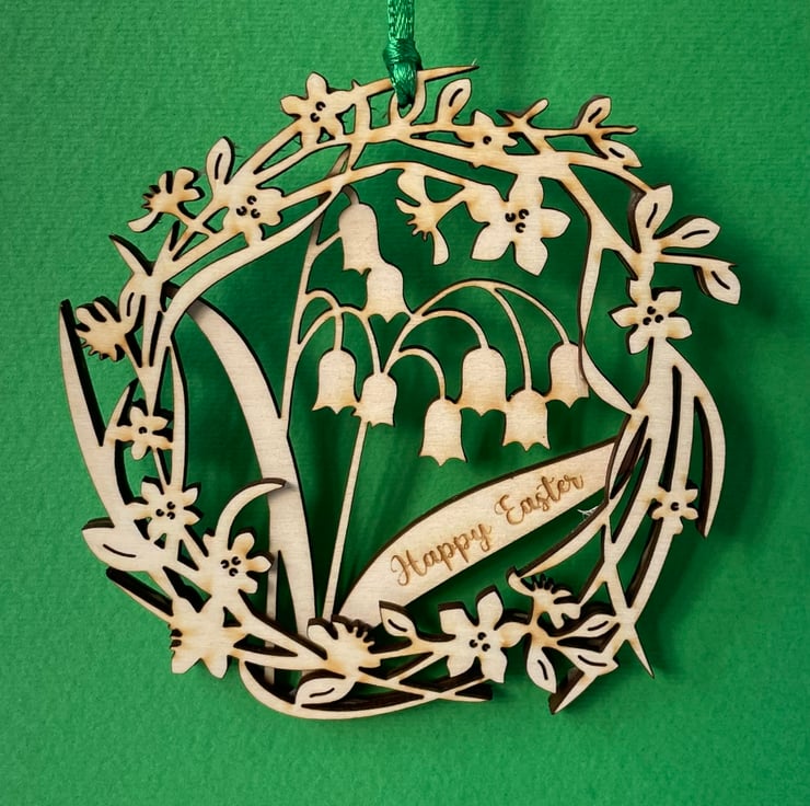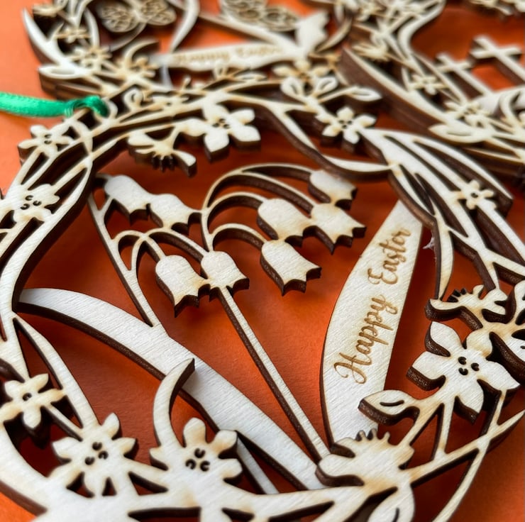 An original design incorporating two layers of 3mm plywood and finished with a 3mm ribbon. The decoration is etched with the words 'Happy Easter'.