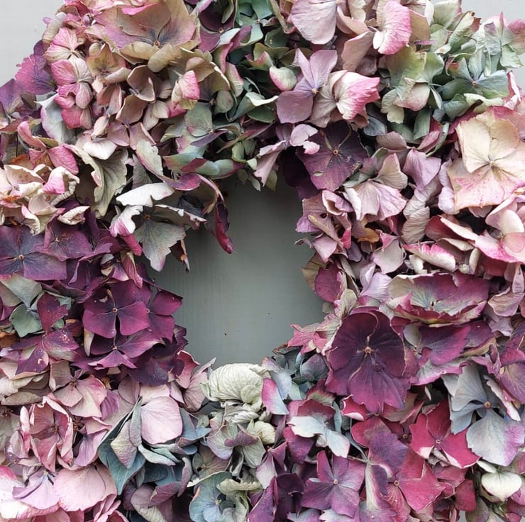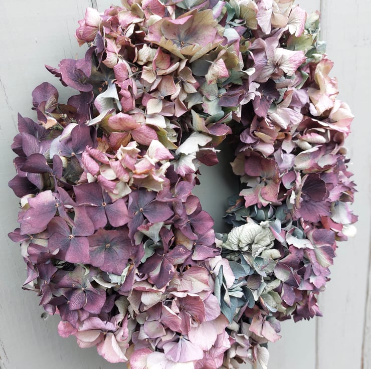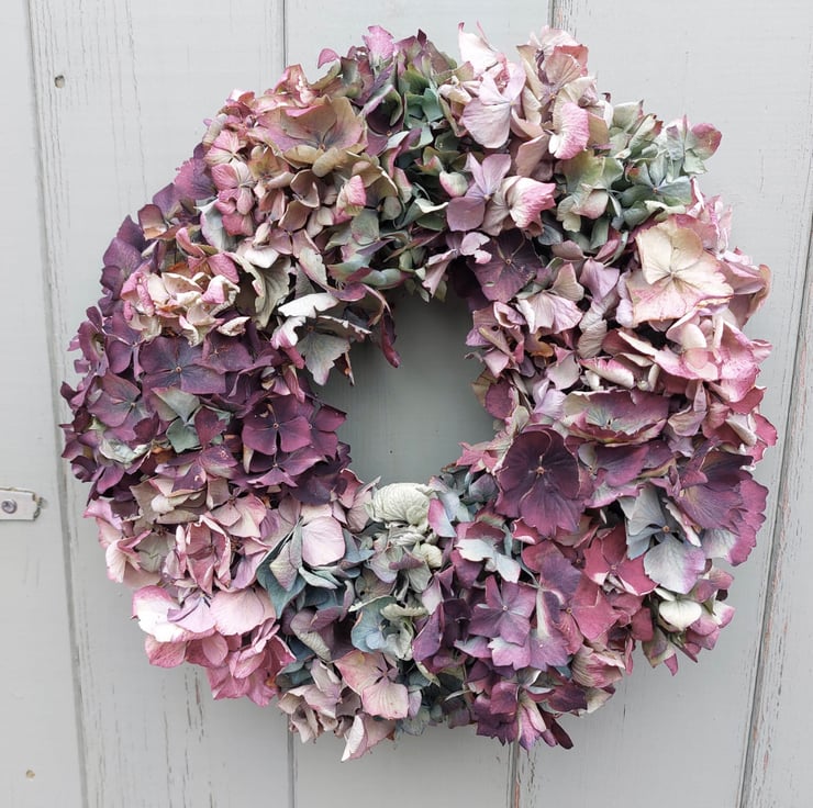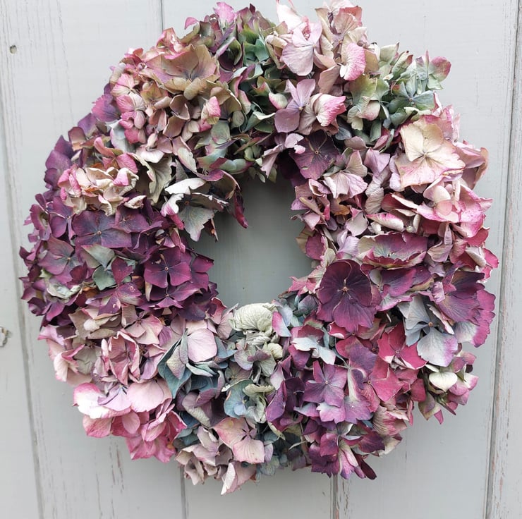 A handmade dried hydrangea wreath measuring approximately 27cm in diameter in shades of purple, blue, and dark red.