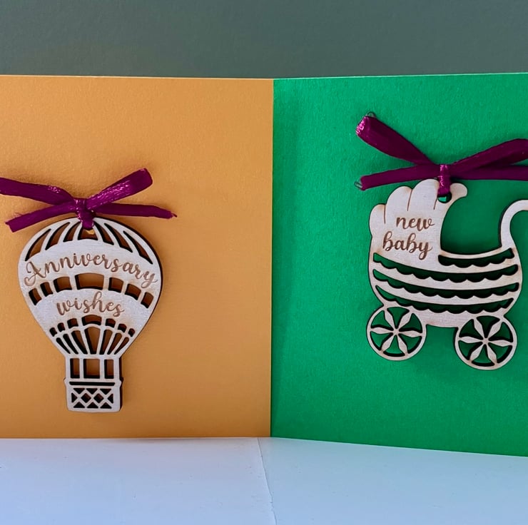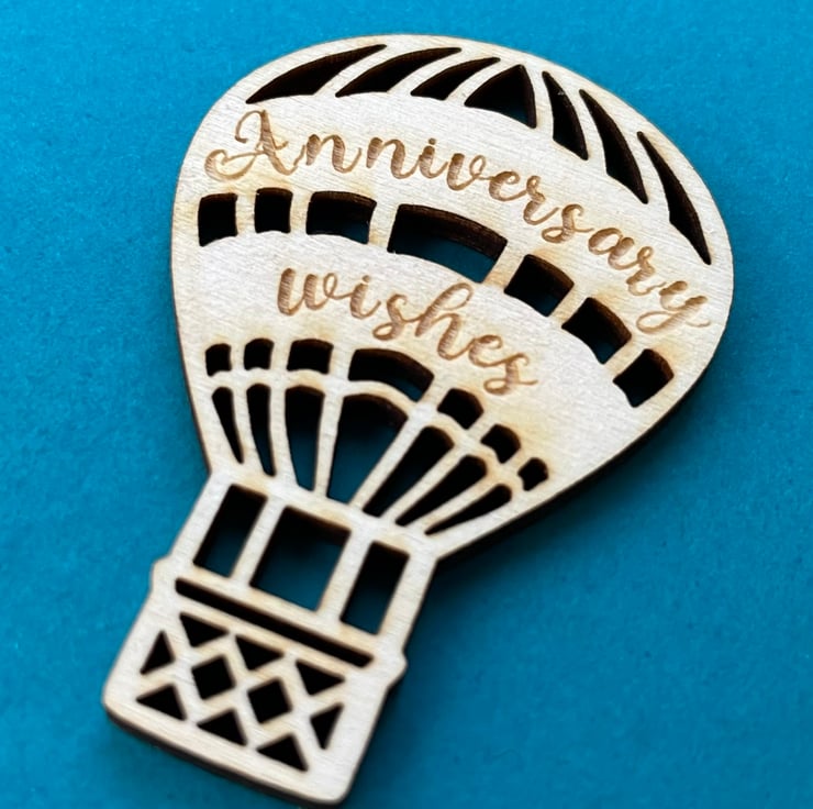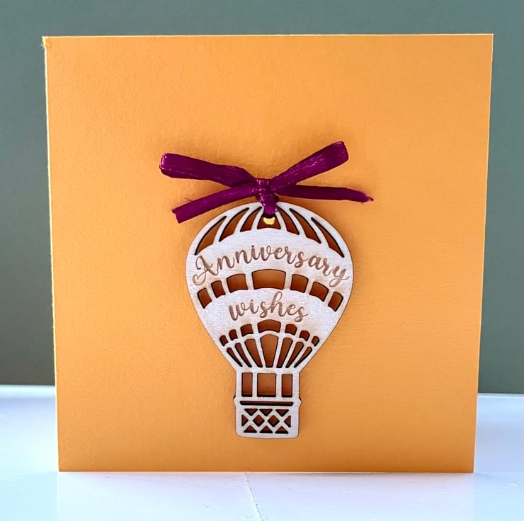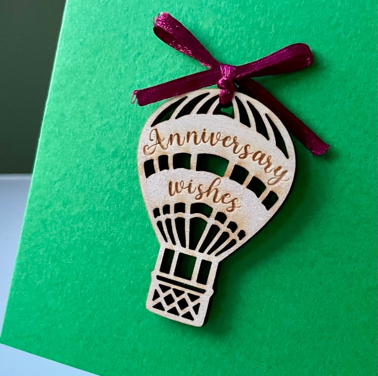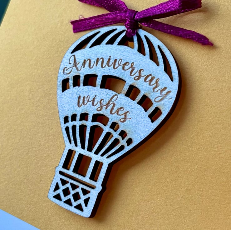 This cute card doubles up as the perfect card and gift. The card itself is blank inside for you to write your message. The delicate wooden hot air balloon incorporates the words 'Anniversary wishes' and can be untied and kept for use as a decoration.
