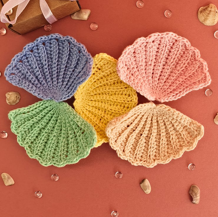 The face scrubbies are hand crocheted with 100% cotton yarn in various, pastel colours. This specific set includes 1 beige, 1 yellow, 1 pink, 1 light blue & 1 mint green. They are in the shape of a seashell and they measure approx. 10x7cm (widest points). They can be used with your usual cleanser or water to remove make-up. Rinse them after use, shape & lay them flat to air-dry & reuse them. Wash them regularly in a wash bag (isn't included on this listing) to maintain them.