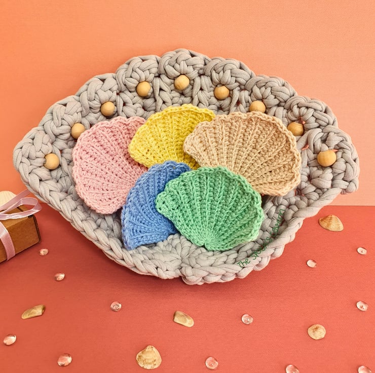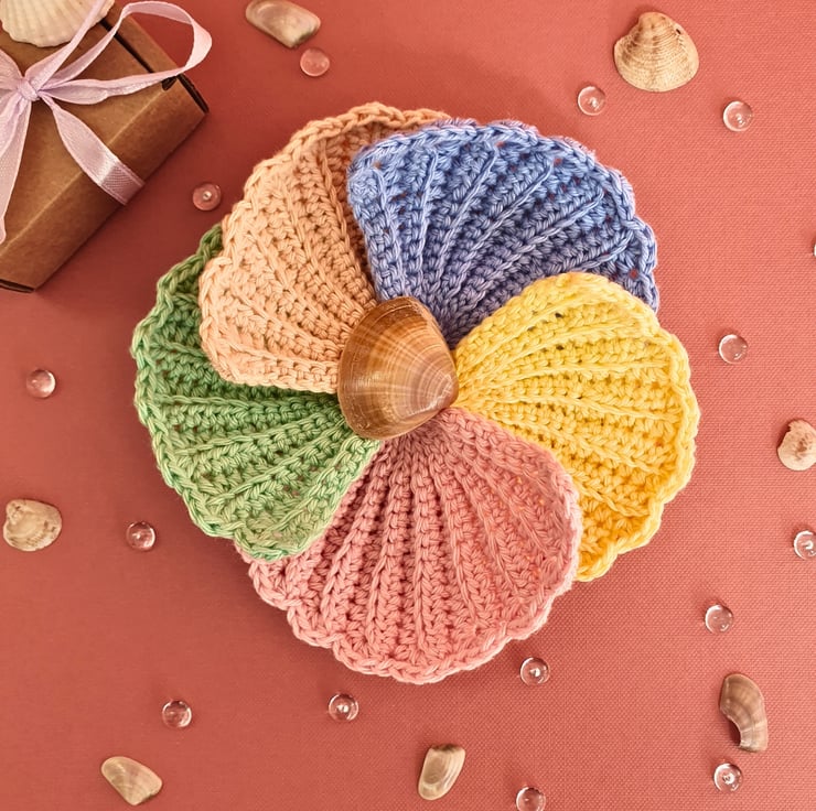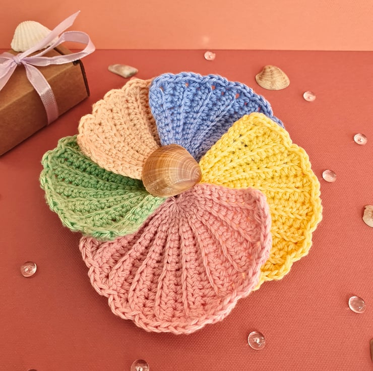 The face scrubbies are hand crocheted with 100% cotton yarn in various, pastel colours. This specific set includes 1 beige, 1 yellow, 1 pink, 1 light blue & 1 mint green. They are in the shape of a seashell and they measure approx. 10x7cm (widest points). They can be used with your usual cleanser or water to remove make-up. Rinse them after use, shape & lay them flat to air-dry & reuse them. Wash them regularly in a wash bag (isn't included on this listing) to maintain them.