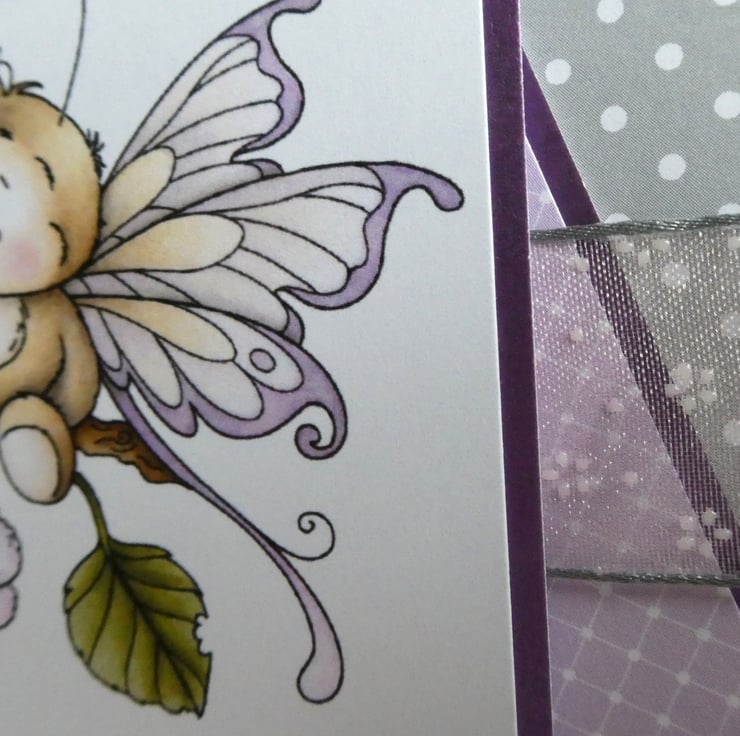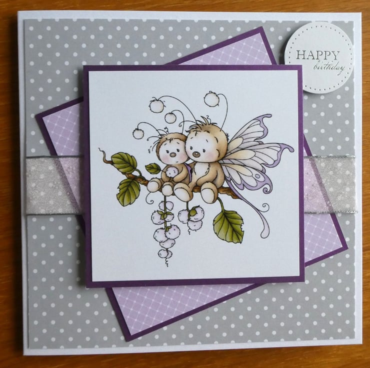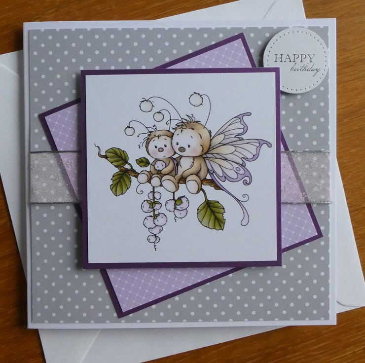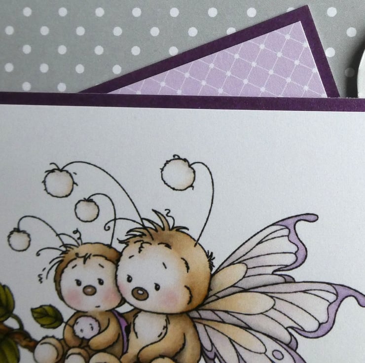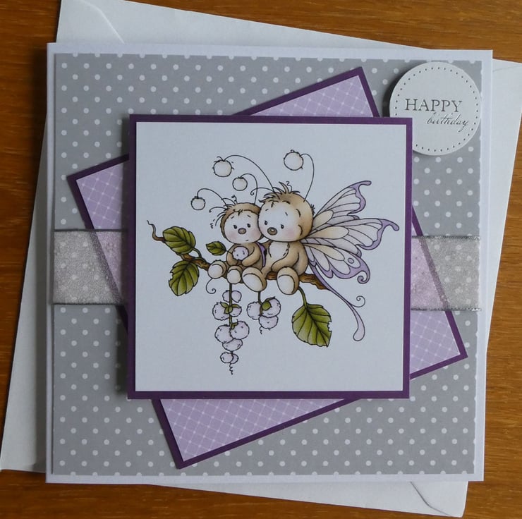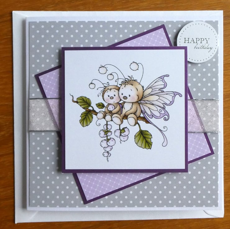 With the message Happy Birthday, this sweet birthday card in shades of lilac, purple and green, has a printed topper showing two little winged bugs, sitting on a twig with trailing blossoms and leaves.