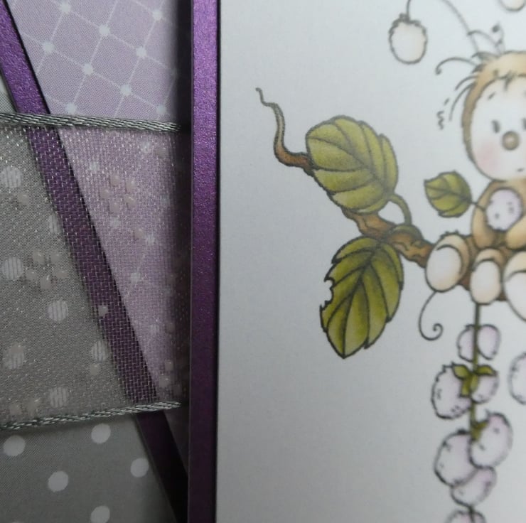 The image has been mounted onto purple pearlescent card to frame it and then raised on foam pads above a layer of lilac card with a white grid pattern which has been offset onto a layer of card with white polka dots on a grey background.