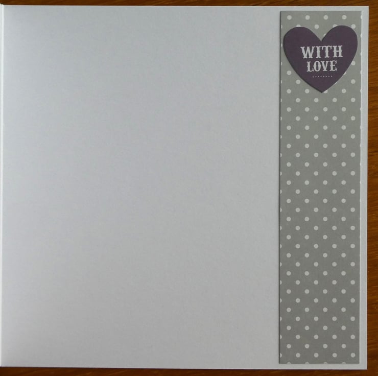 The inside of the card has a band of matching grey and white polka dot patterned card down the right hand side with a purple heart shaped message with the words With Love in white, leaving plenty of space for you to write your own birthday greeting.