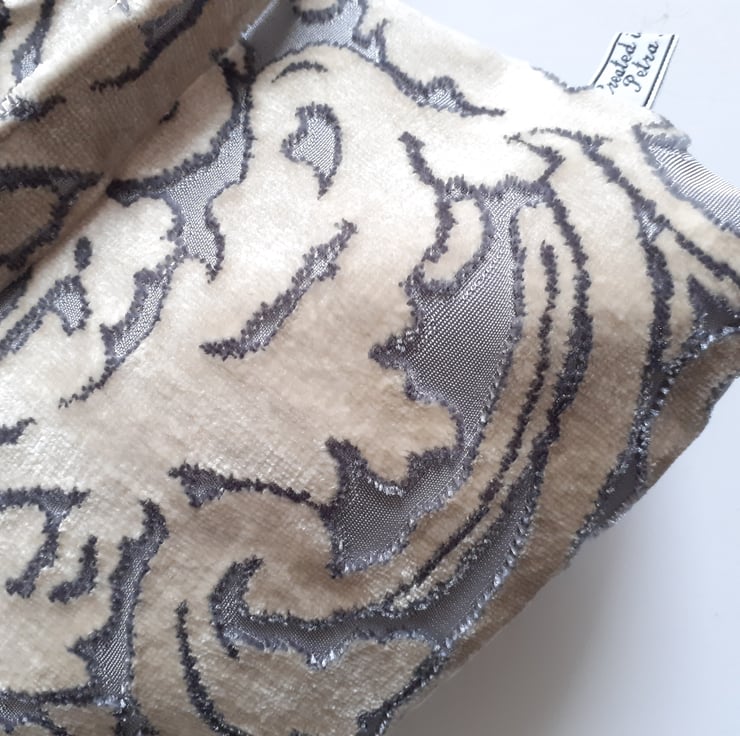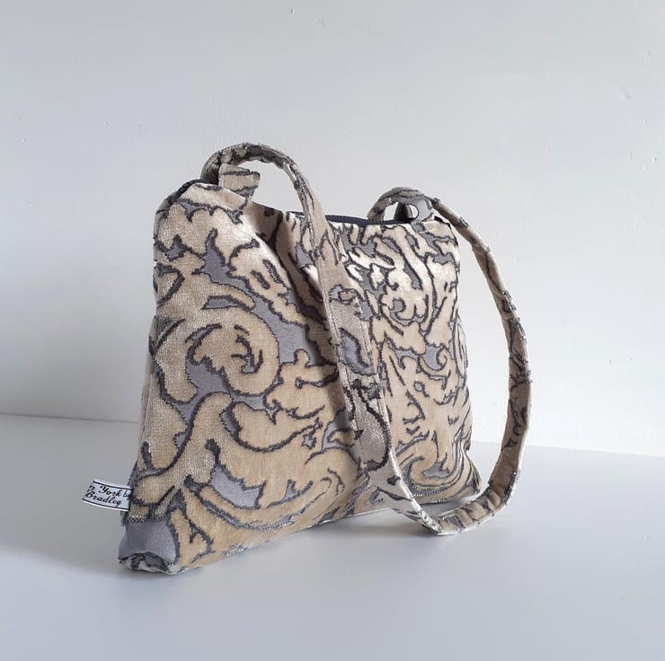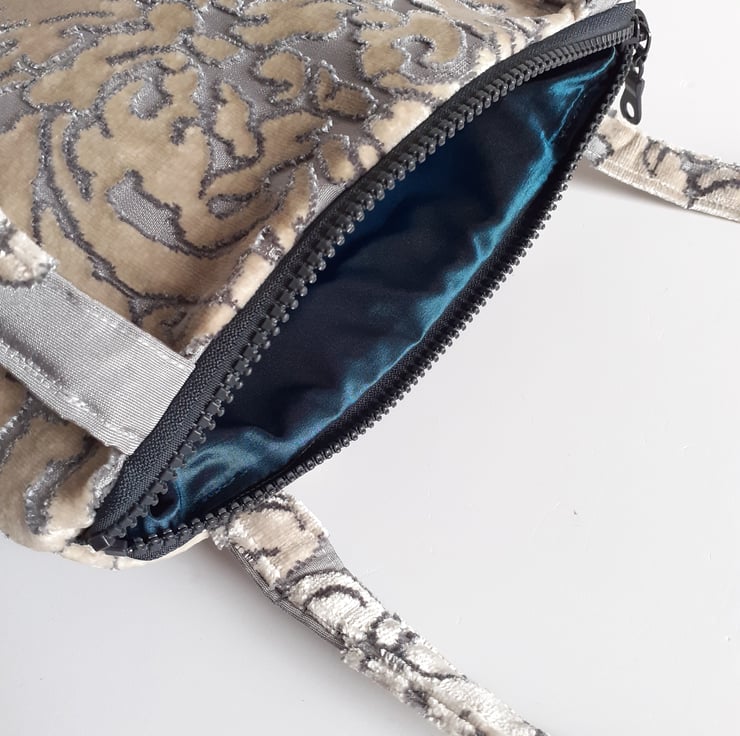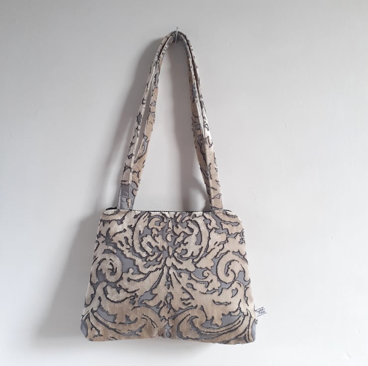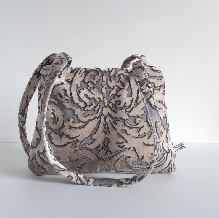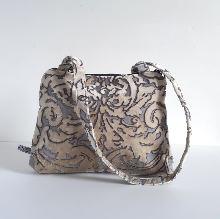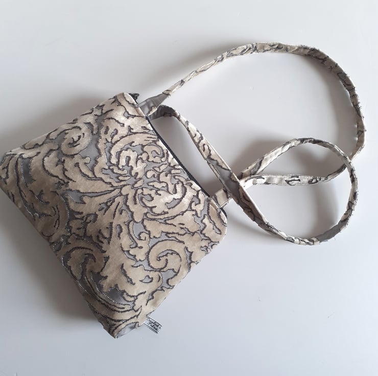 This luxurious textile is a beautiful designer remnant I bought from a seasonal sale in a re-upholstery shop. It has the feel and look of cut back velvet with its silver and grey shimmer, and reminds me of sumptuous costumes! I have made it into a practical shoulder bag or handbag. It has two straps, as well as an internal pocket for the flotsam and jetsom of your life, and fits neatly under your arm. Large enough to carry all your essentials with style, this shoulder bag closes with a satisfying chunky zip.