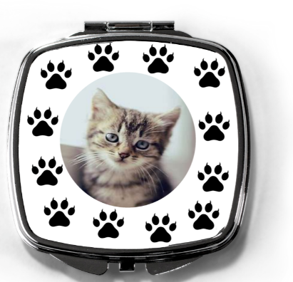 This custom pet mirror is personalised with your cat photo with a stylish pawprints outline around a photo of your pet. Printed onto a useful compact mirror this is a useful gift that can be carried around with you everywhere.