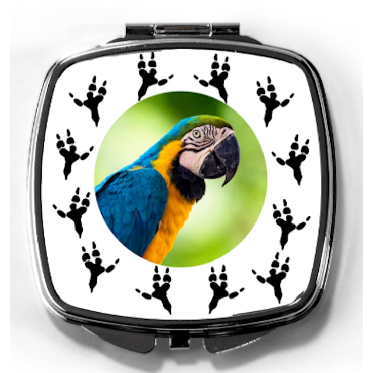 This custom pet mirror is personalised with your bird photo with a stylish claw prints outline around a photo of your bird. Printed onto a useful compact mirror this is a useful gift that can be carried around with you everywhere.
