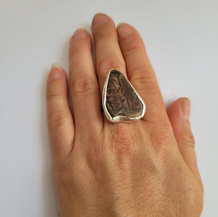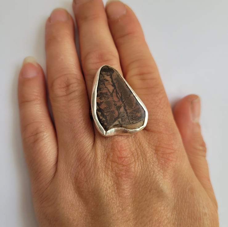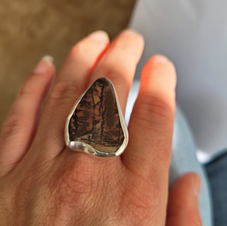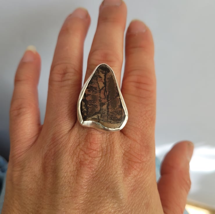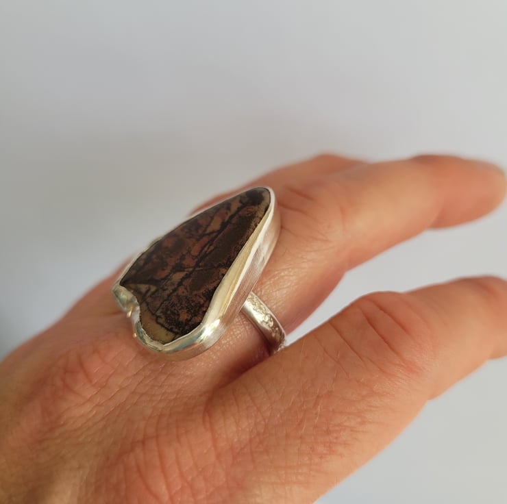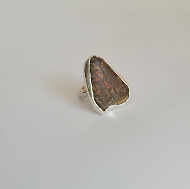 The ring band and stone setting has been handmade from solid sterling silver. The stone is jasper, which was given to me by a friend. I liked the stone as it reminded me of a forest scene, with a sunset glowing through the trees
