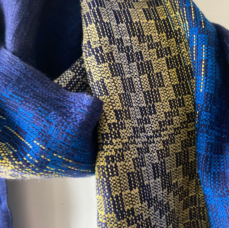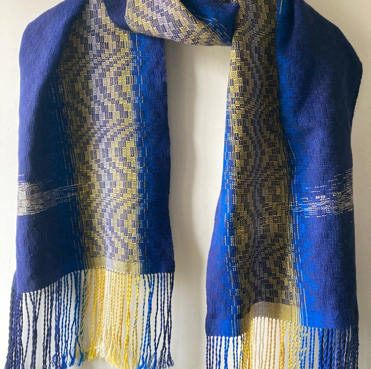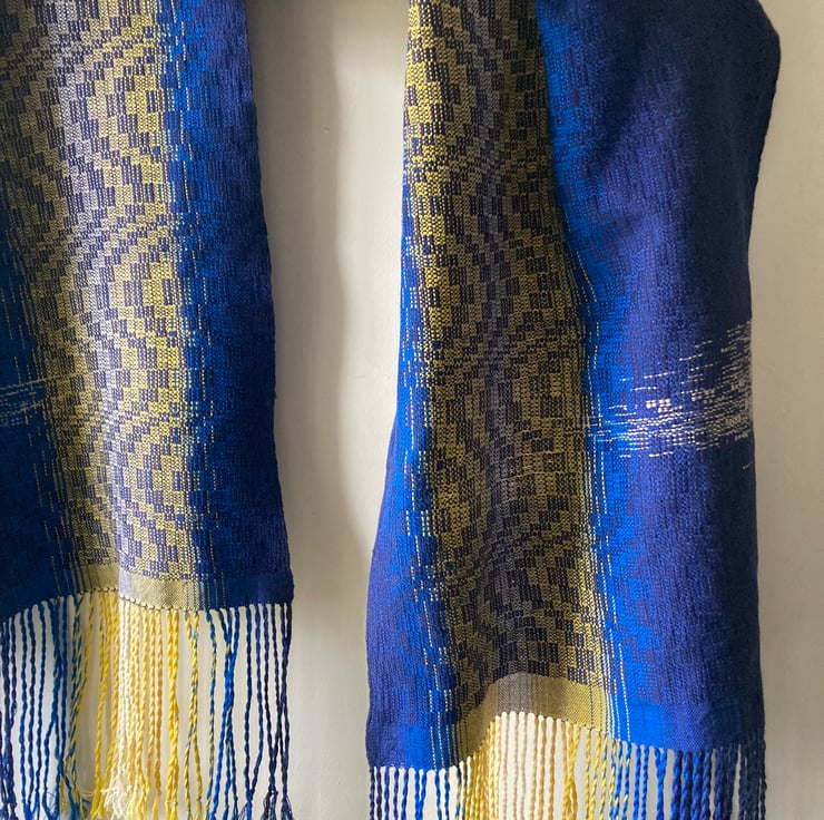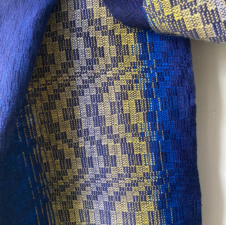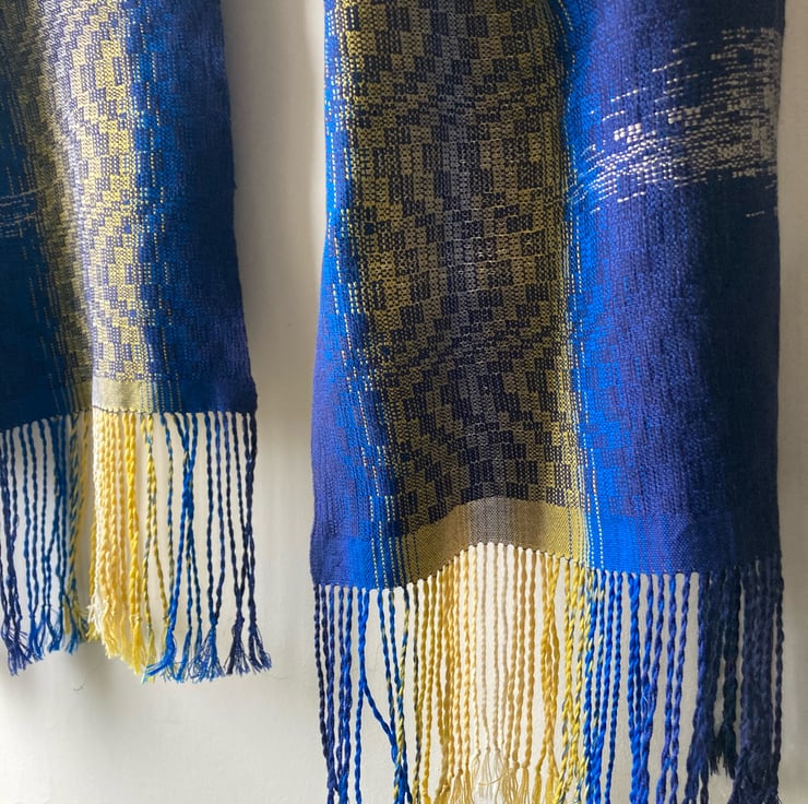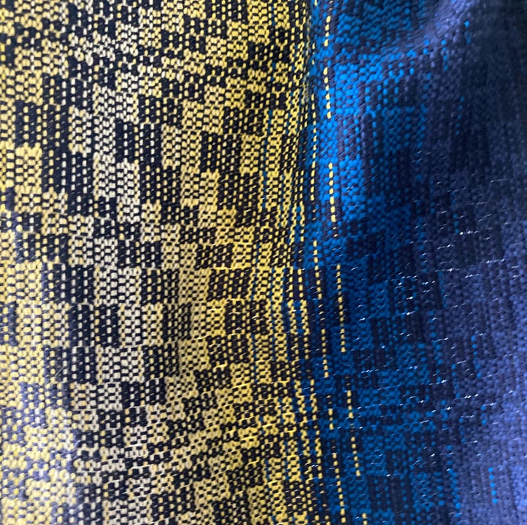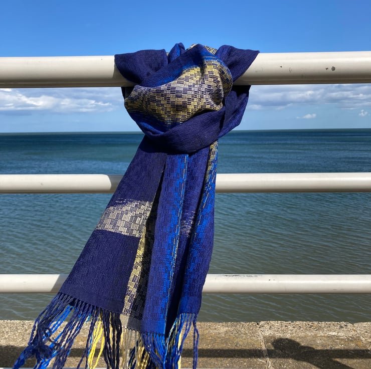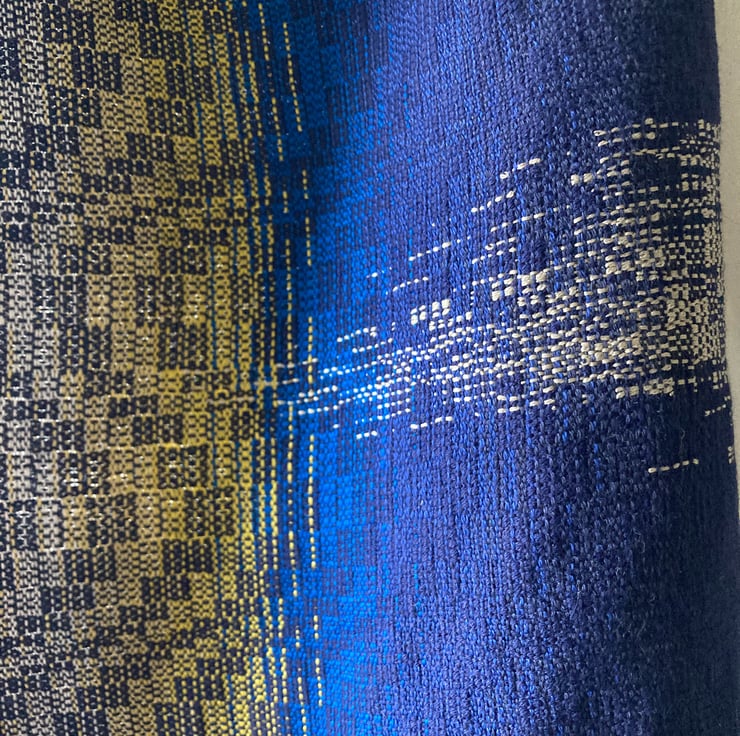 A dramatic wrap for a special night out, handwoven in super-fine pima cotton and embellished with silk. Woven on a Fibonacci gradient warp from deep French navy through to the softest yellow, it conjures images of Van Gogh and Mozart, or swirling stars on the darkest night. With a brocade-like feel and superb drape it’s an all-year-round accompaniment to any outfit.