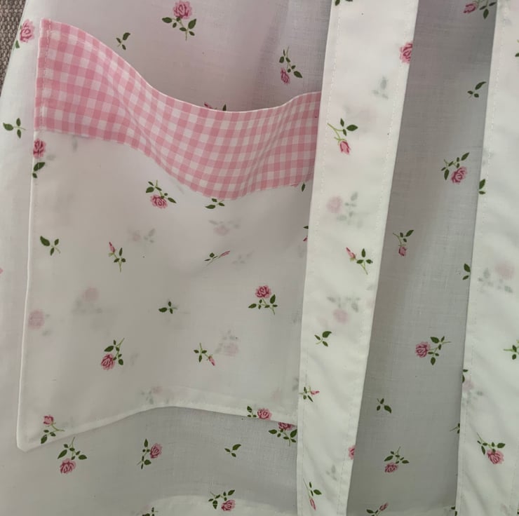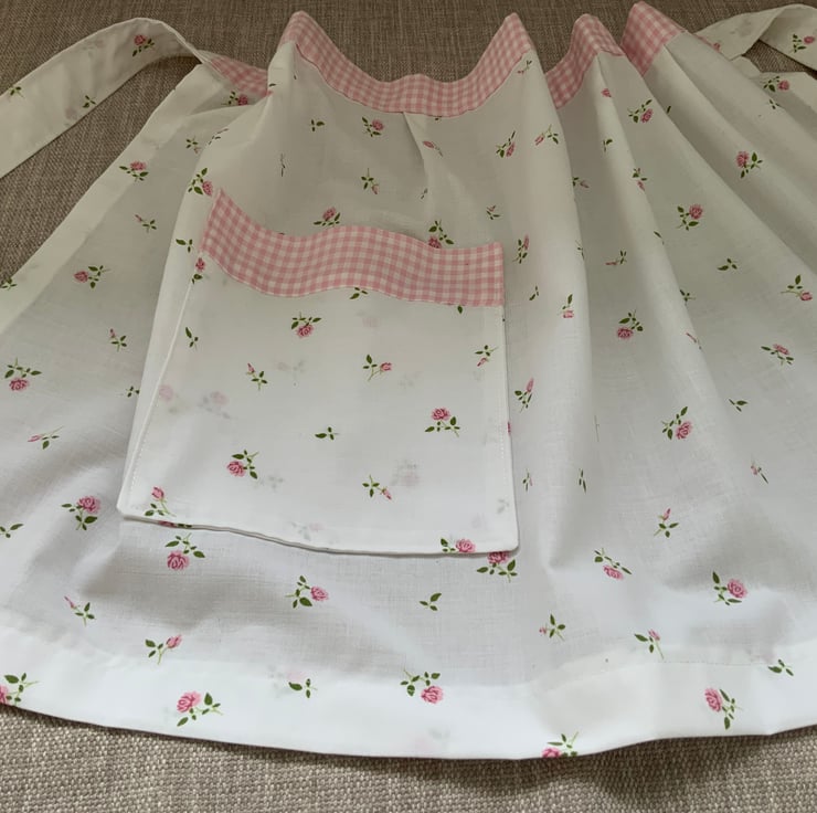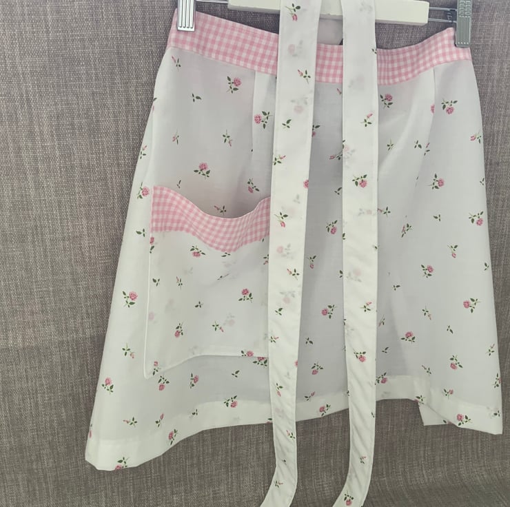 Pretty ditsy vintage floral half apron with a few pleats at waistband and small side pocket. It is made from 100% vintage upcycled cotton, white background with pretty ditsy flowers and pink gingham. This apron has a fully lined small side pocket.