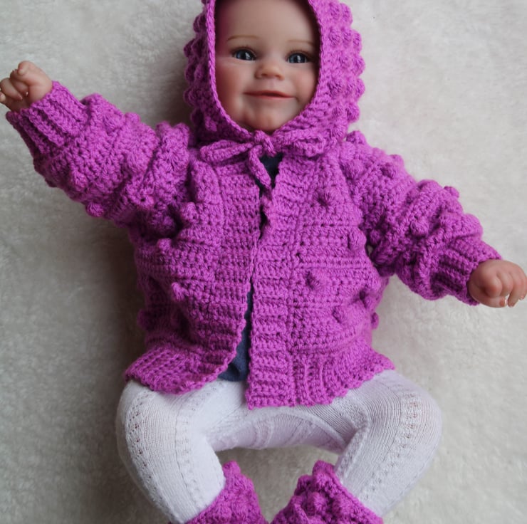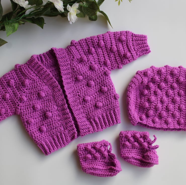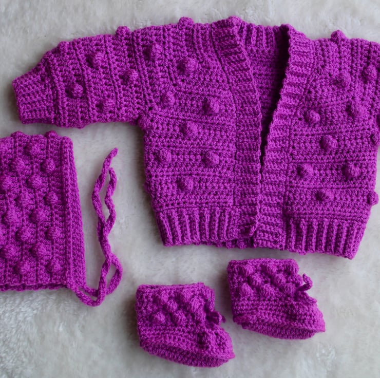 This new baby set features a long sleeved bobble cardigan that is easy to slip on and off, a bobble bonnet that ties securely under the chin and a pair of bobble booties that tie around the ankles to stop the booties coming off.