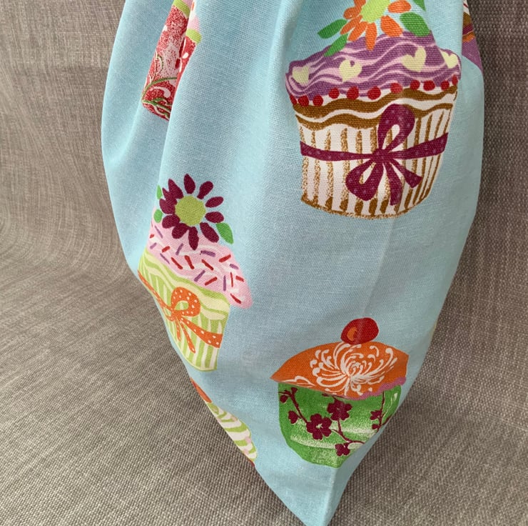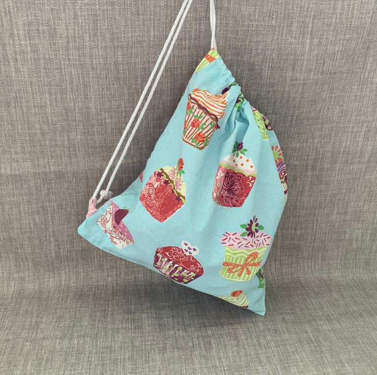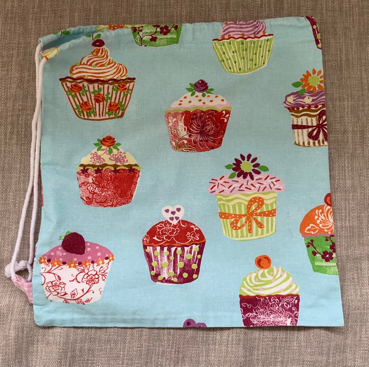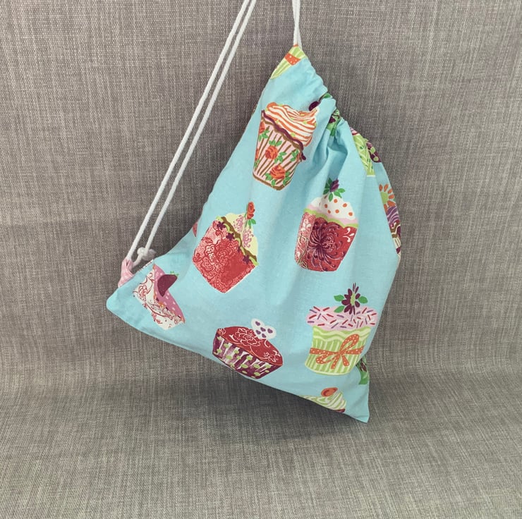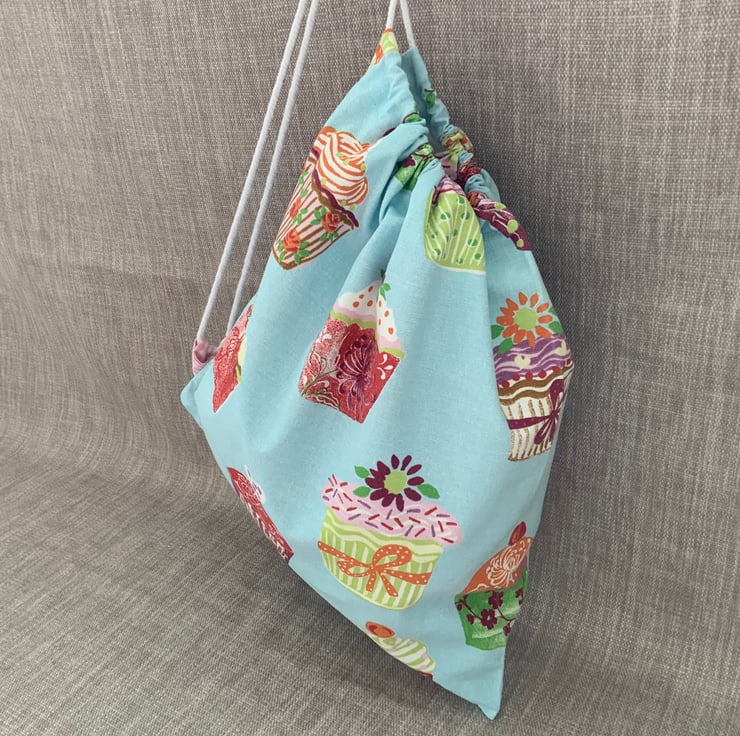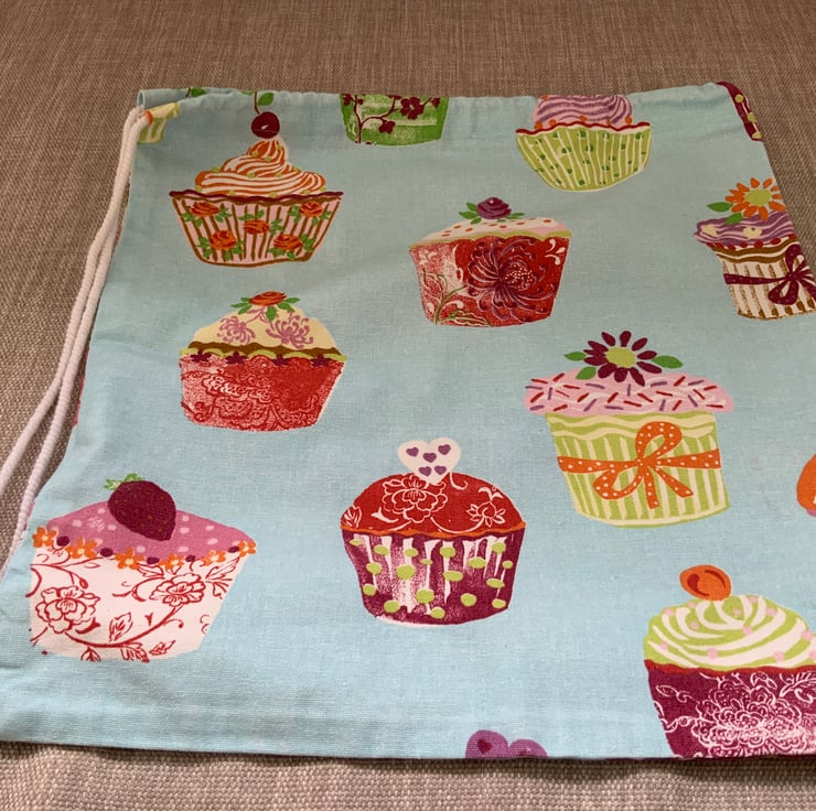 Drawstring bag made from 100% cotton cupcake design. It features a drawstring cord which can be popped over the shoulder for carrying. Internally it is finished with neat french seams so there are no raw edges.