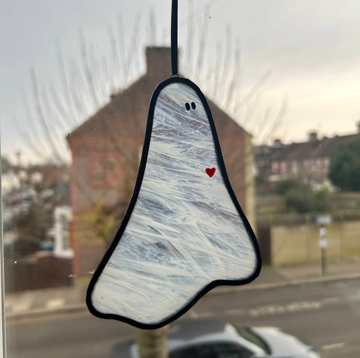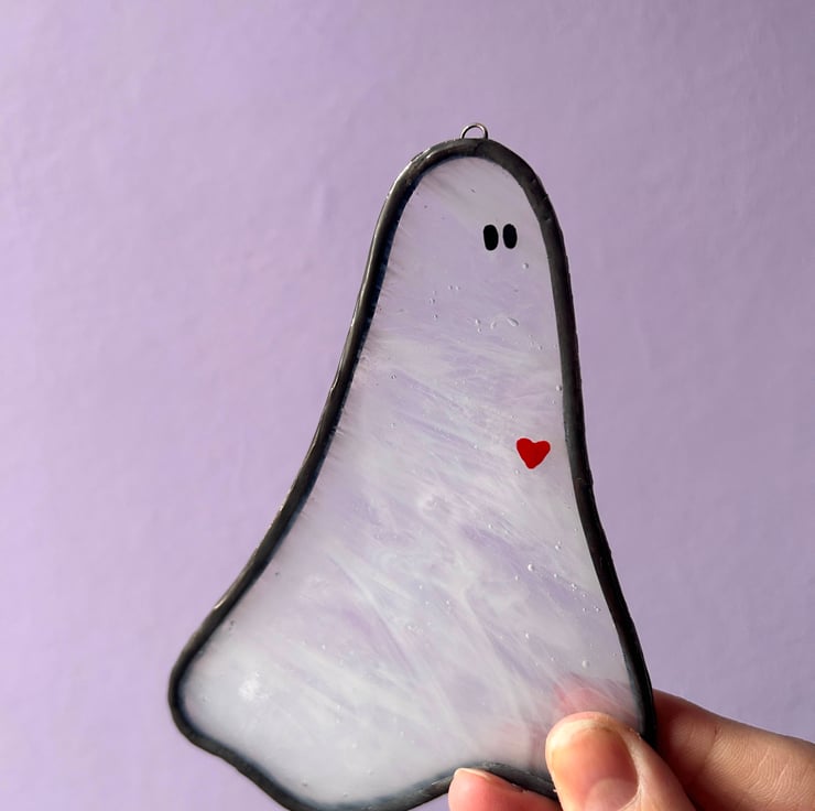 A little ghost with a lot of love! This stained glass ghost is a signature design, now featuring a delicate hand-painted love heart. Crafted from high-quality glass with soft, ethereal hues, it catches the light beautifully, adding a touch of charm to any space. Perfect for spooky souls and hopeless romantics alike, this friendly spirit is ready to haunt your home in the sweetest way. Each ghost is completely unique but all equally spooky.