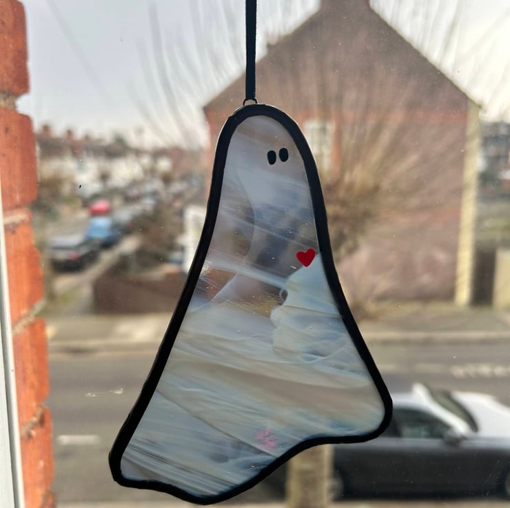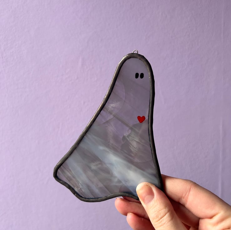 A little ghost with a lot of love! This stained glass ghost is a signature design, now featuring a delicate hand-painted love heart. Crafted from high-quality glass with soft, ethereal hues, it catches the light beautifully, adding a touch of charm to any space. Perfect for spooky souls and hopeless romantics alike, this friendly spirit is ready to haunt your home in the sweetest way. Each ghost is completely unique but all equally spooky.