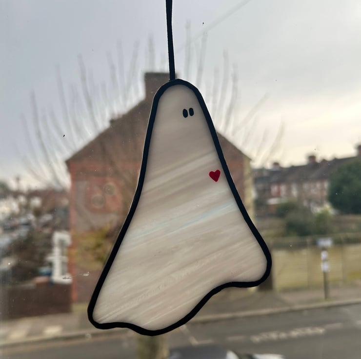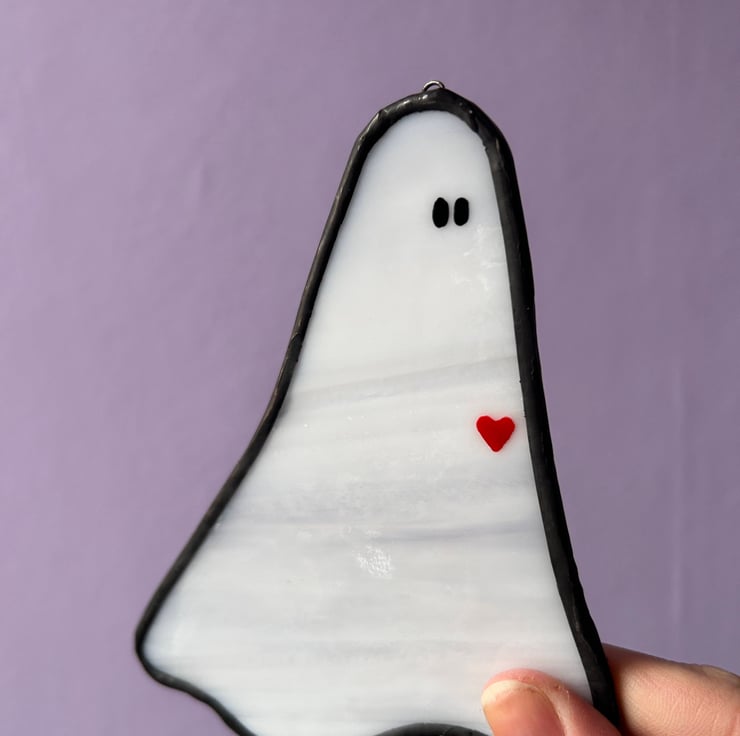 A little ghost with a lot of love! This stained glass ghost is a signature design, now featuring a delicate hand-painted love heart. Crafted from high-quality glass with soft, ethereal hues, it catches the light beautifully, adding a touch of charm to any space. Perfect for spooky souls and hopeless romantics alike, this friendly spirit is ready to haunt your home in the sweetest way. Each ghost is completely unique but all equally spooky.