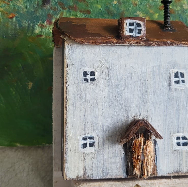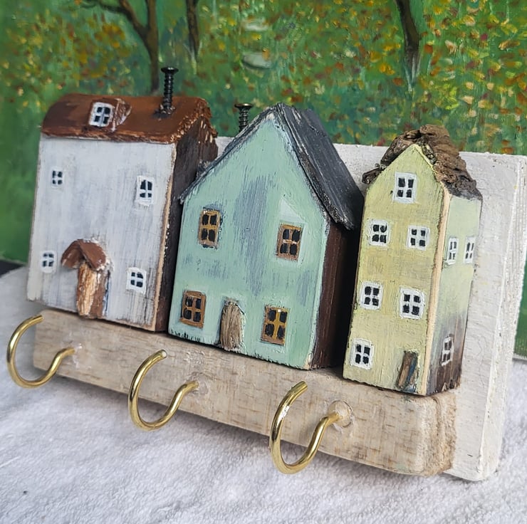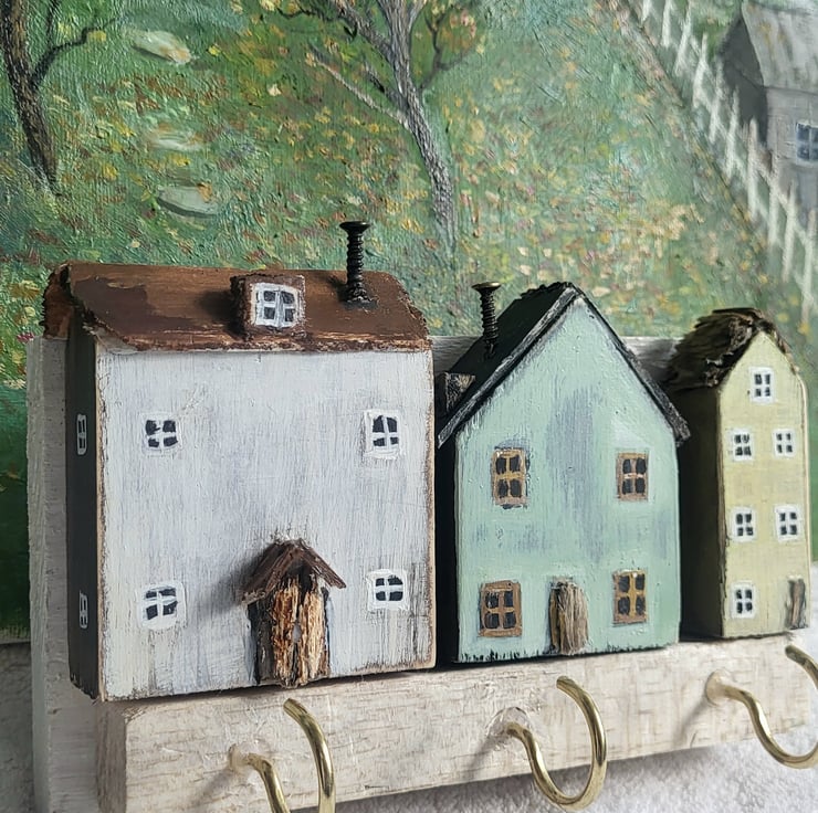 'Rustic Cottages' is a handmade key hook /key holder /Key rack is sanded back to create a weathered effect, exposing the wood beneath. The roof is made from a variety of light woods and reclaimed wood dependent on what is available at the time. The cottage doors are made from reclaimed wood. The key holder has a sawtooth hook on the back to hang on the wall. There are three gold coloured hooks or three silver coloured chrome hooks. Please message me for choice of paint colour and chrome hooks.