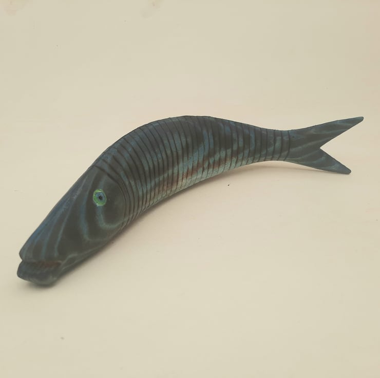 36 cms fish in pine. It has been lightly torched to enhance the grain. Long enough to stand on its tail.