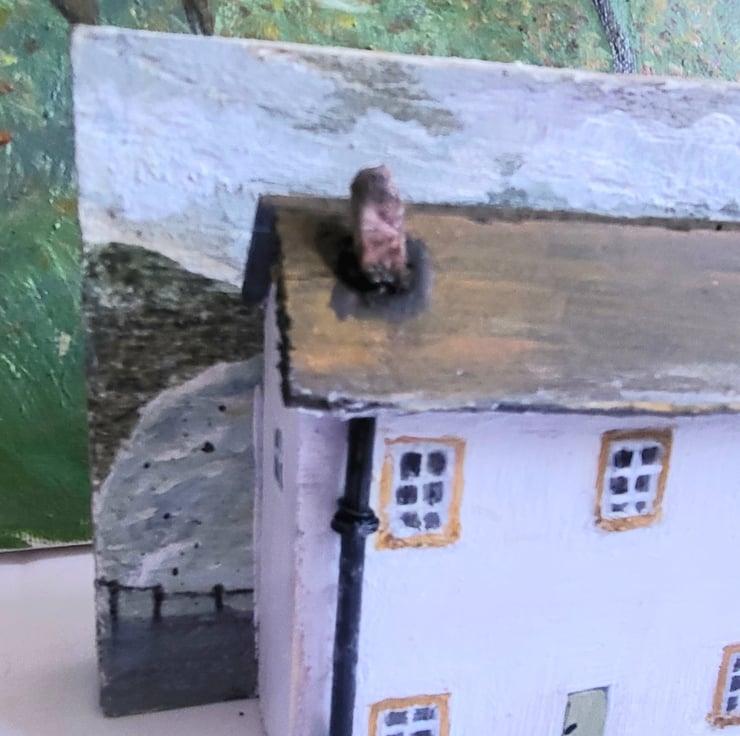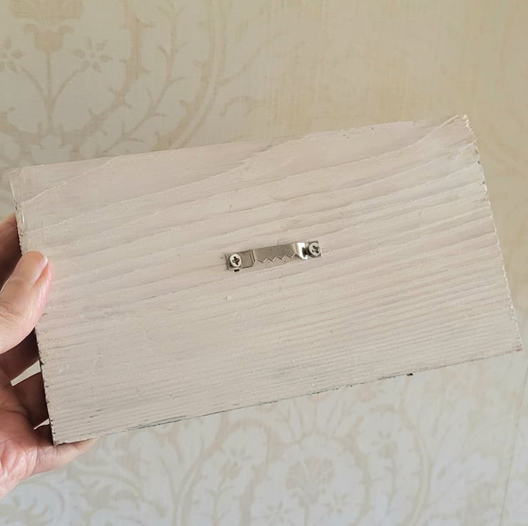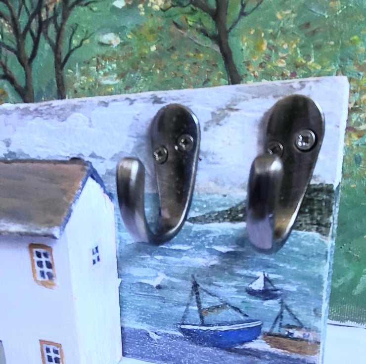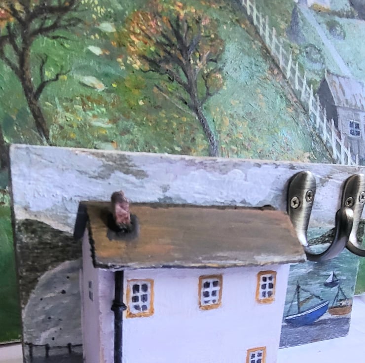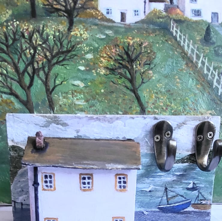 Handmade key hook /key holder / Key Rack with a little wooden cottage and painted seaside scene. The wooden house is painted in white and sealed with a light, satin varnish after sanding back to create a weathered effect, exposing the wood beneath. The roof is made from lightweight wood. The key holder has a sawtooth hook on the back to hang on the wall. The key holder has antique brass hooks.