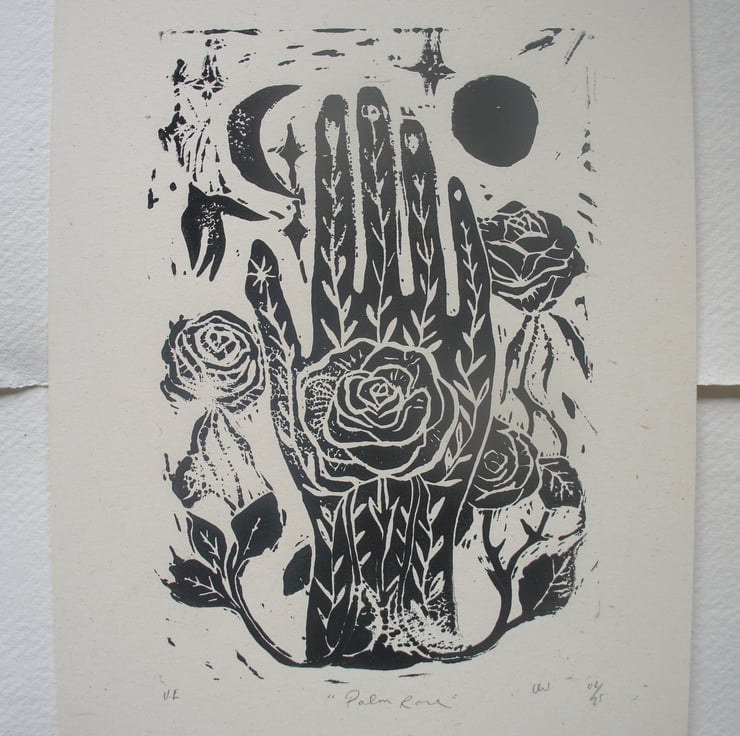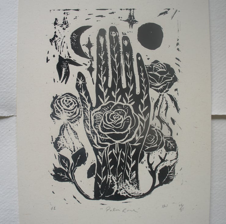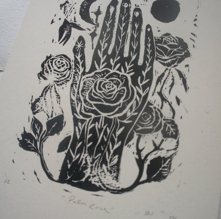 A perfectly imperfect linocut depicting a hamsa with flowers, a rose and birds.