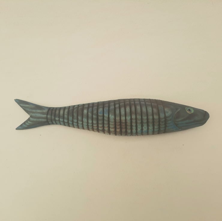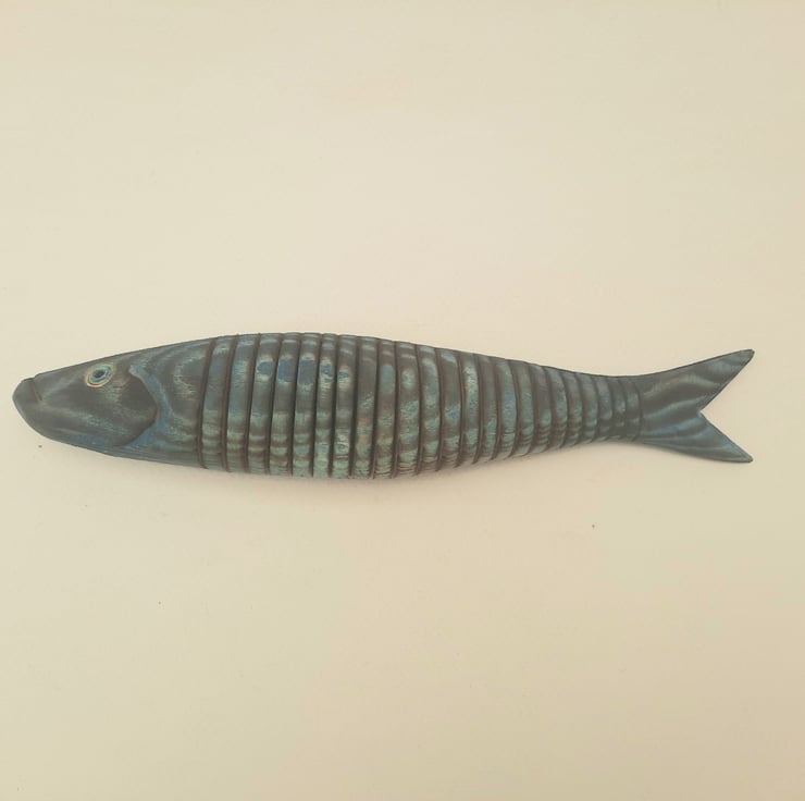 26 cms fish in pine. Lightly torched to enhance the grain.