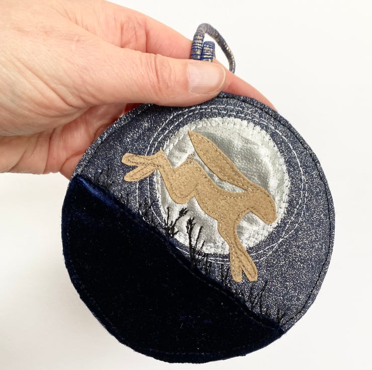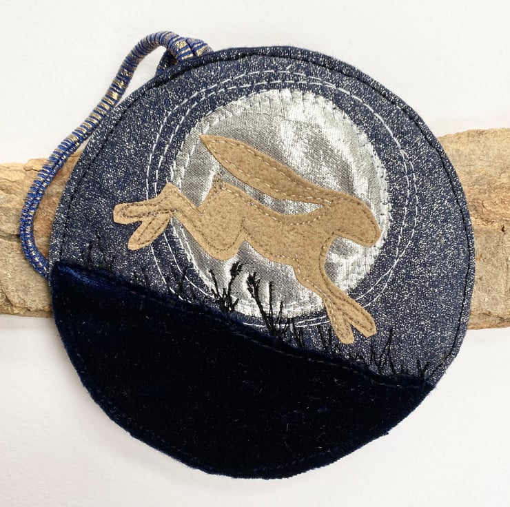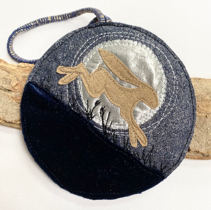 This atmospheric embroidered hare home decoration shows a running hare across a full moon landscape. It has been made from up-cycled fabrics and stitched down with free motion embroidery. It comes felt backed and measure approx 11.5cm, with the ribbon the length is 21.5cm.
