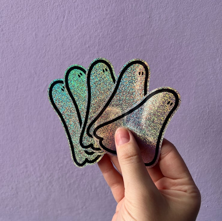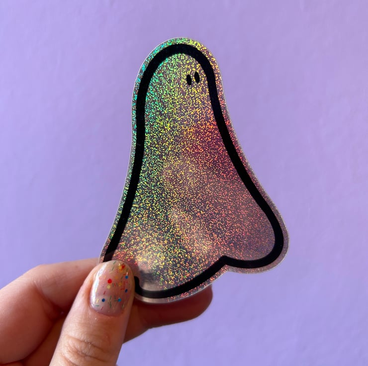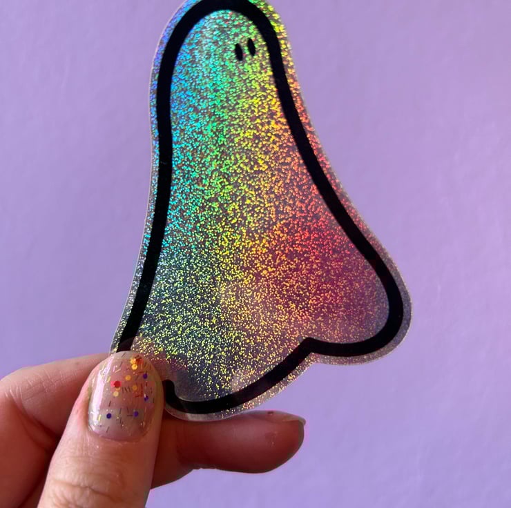 This spooky sticker features my signature ghost design with rainbow glitter background that changes colours in different light, creating a rainbow effect. Perfect for laptops, water bottles, note pads or any other place your heart desires!