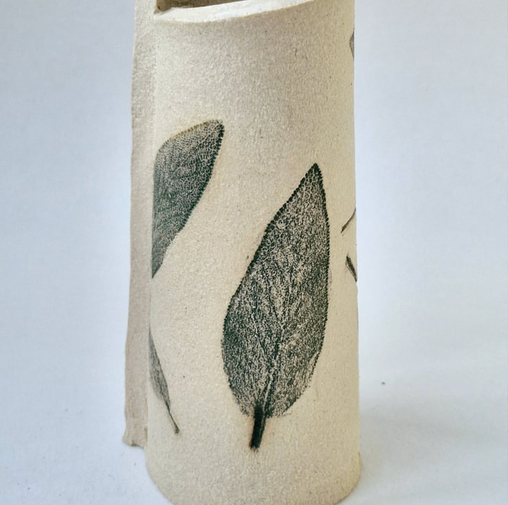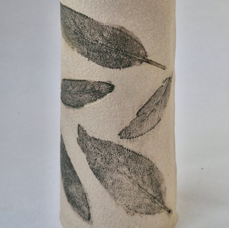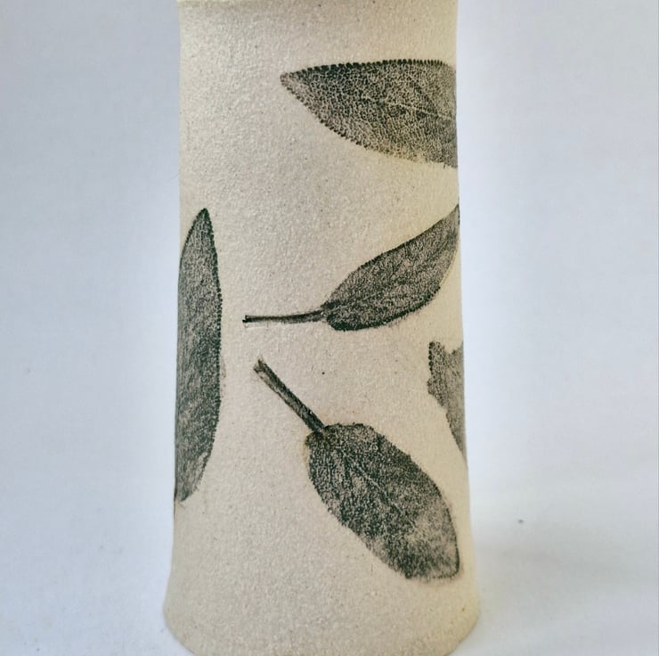 This handcrafted ceramic vase, is decorated with sage leaves, bringing a strong, natural and earthy feel.Contrasting between the strong stoneware and the organic movements that the sage leaves bring.