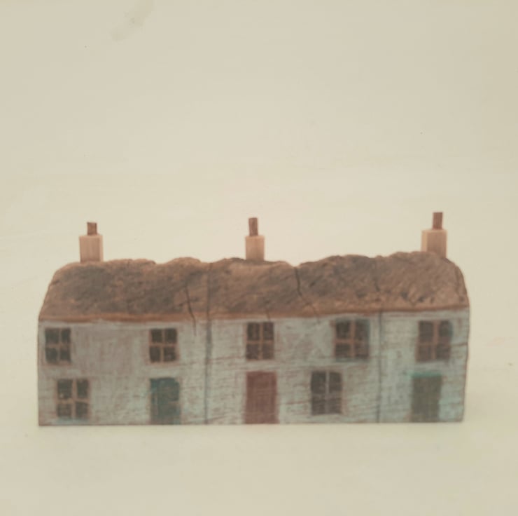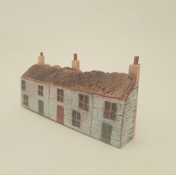 Row of 3 cottages in elm with bark roof. 12 cms long.