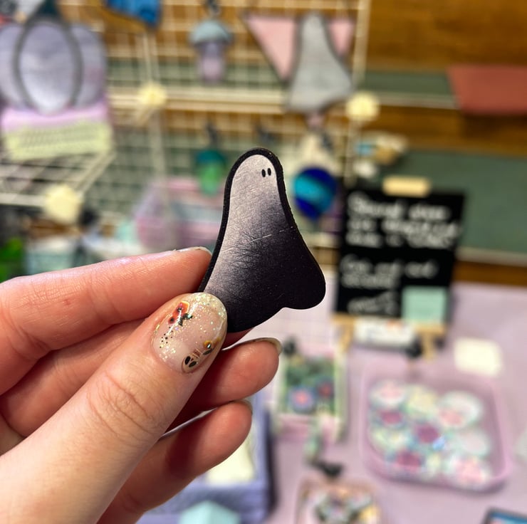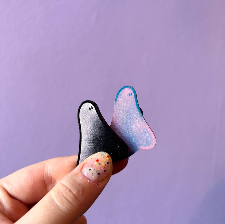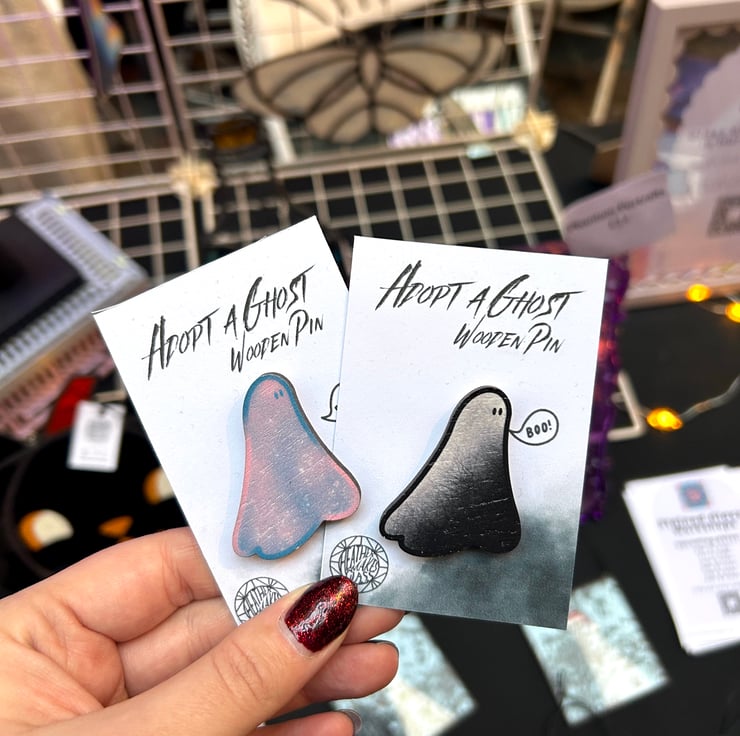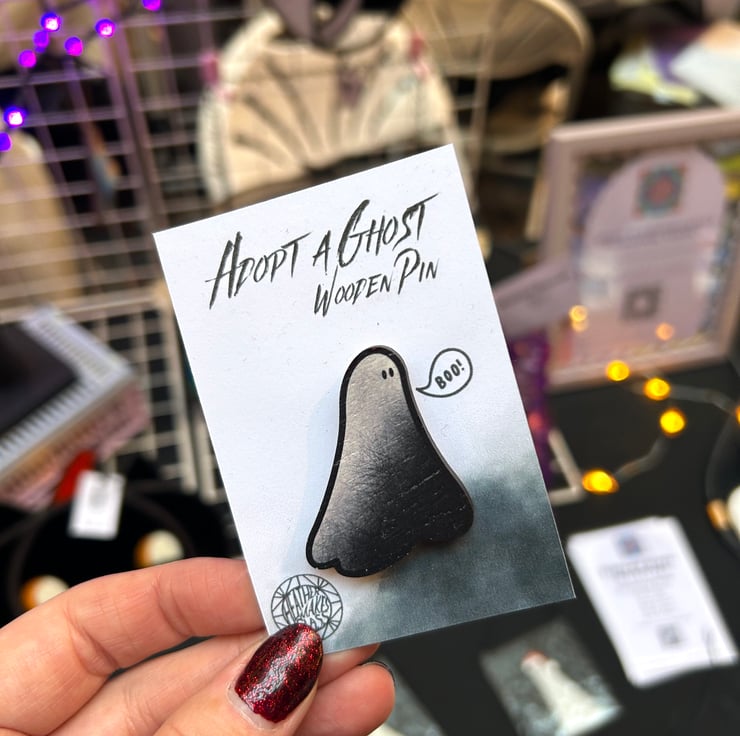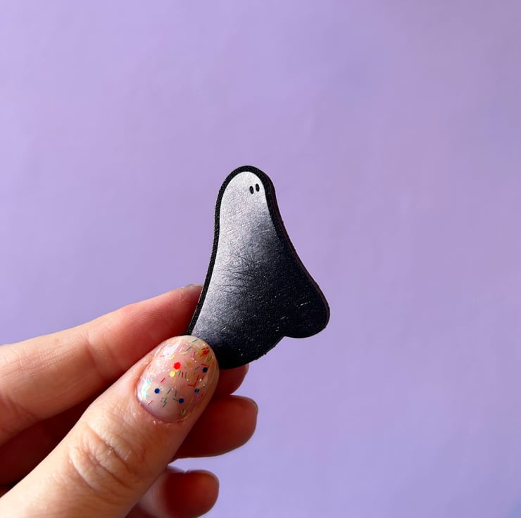 Wooden pin featuring my popular stained glass ghost design.