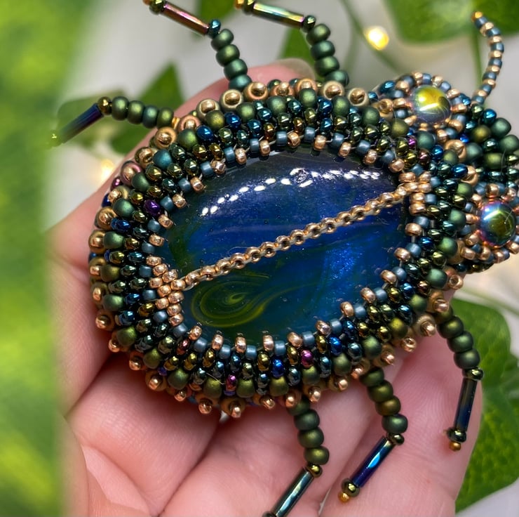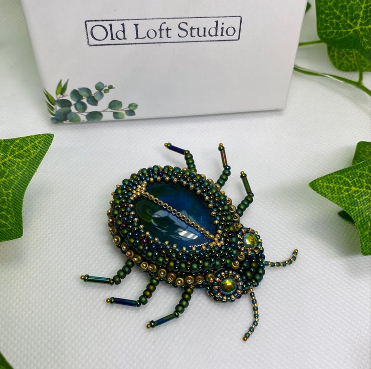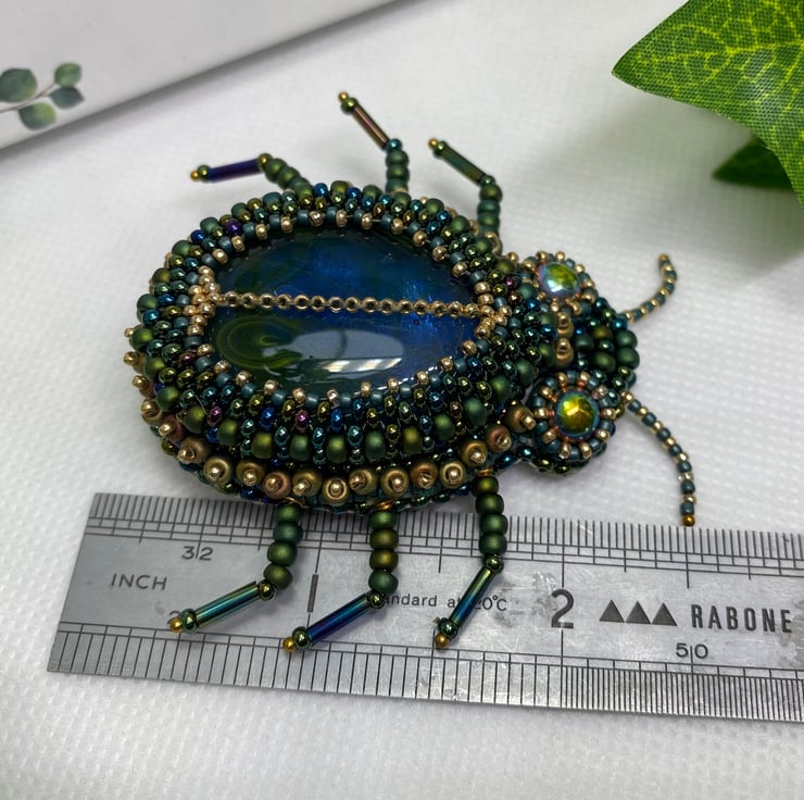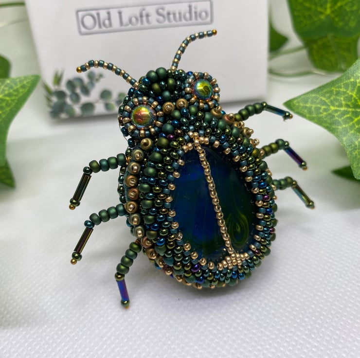 Stunning and unique, this beaded Beetle brooch has been lovingly hand made using a beautiful glass cabochon, the finest Miyuki seed beads and bugle beads.