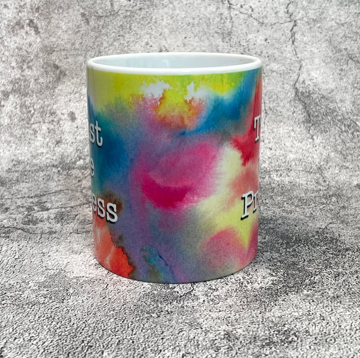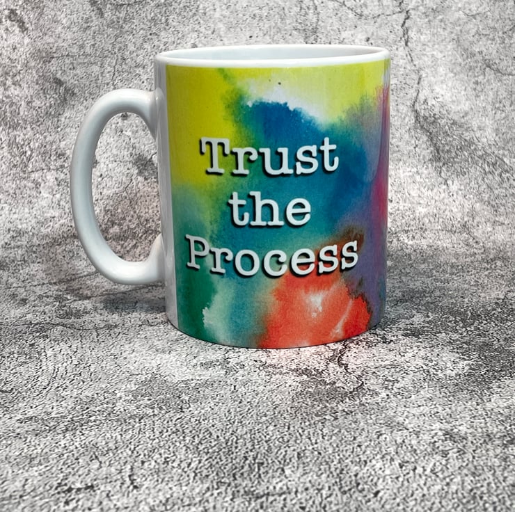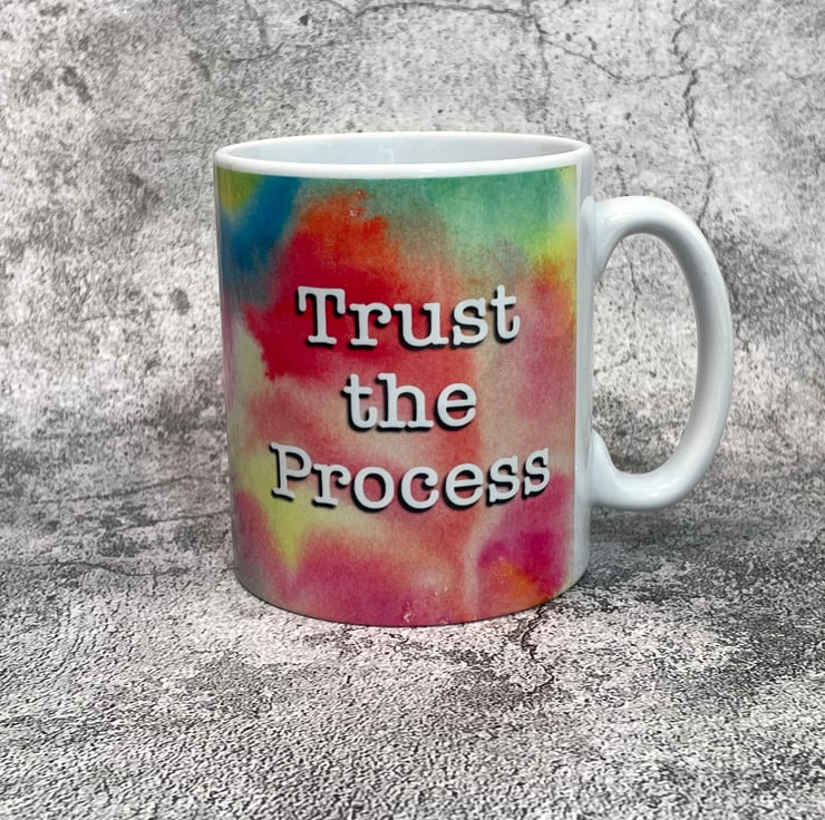 This listing is for a 10oz ceramic mug printed with the motivational motto "Trust the Process" - every creative project goes through and "ugly phase", or feels like it's going to take forever, you've just got TRUST THE PROCESS and it'll all come together eventually! (Plus a cuppa or three ALWAYS helps!)