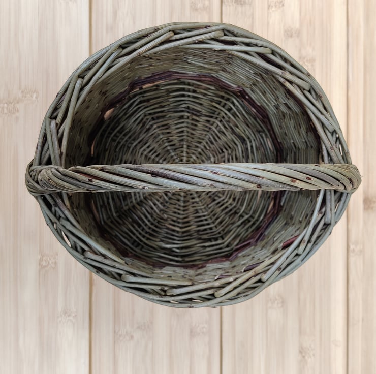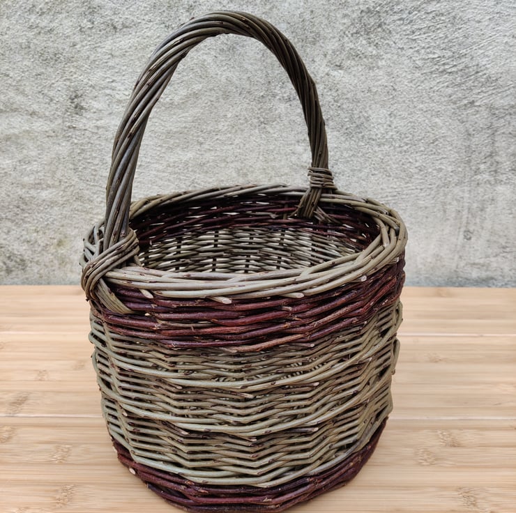 A beautiful handmade basket for all your shopping needs. Alternatively use to forage mushrooms from your local woods. Round basket with wrapped bow handles and herringbone detail.