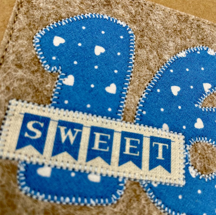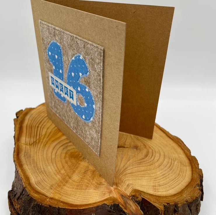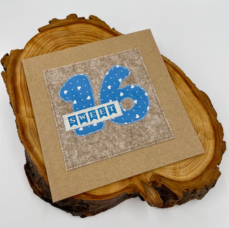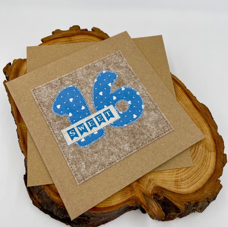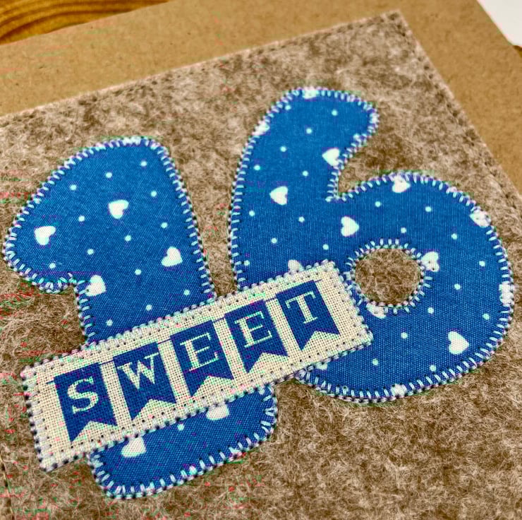 Stitched with love and a touch of country charm, this handmade Sweet 16 card is a keepsake to treasure. The numbers ‘1’ and ‘6’ are cut from the sweetest blue fabric, dotted with tiny white hearts, and carefully appliquéd onto soft wool felt. Above, a dainty ‘SWEET’ banner adds a festive touch, like bunting at a joyful celebration. Finished on recycled card for a rustic, homespun feel, this card is as warm and wonderful as the birthday it’s made for!