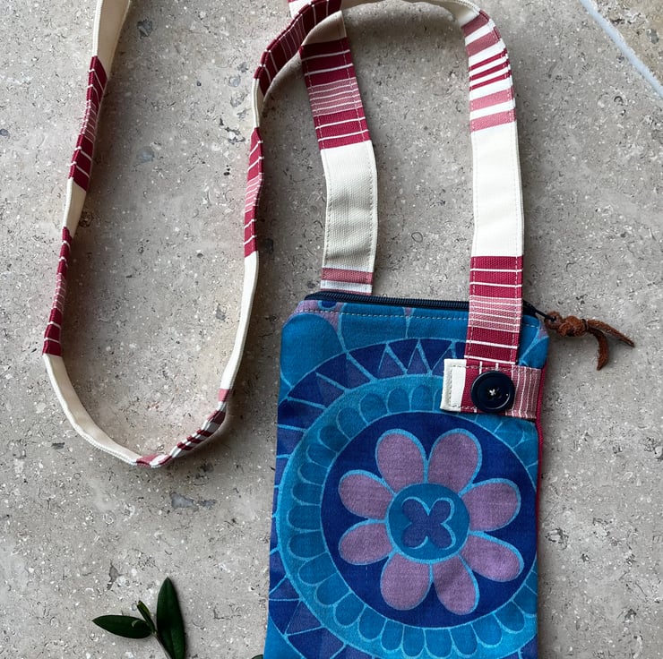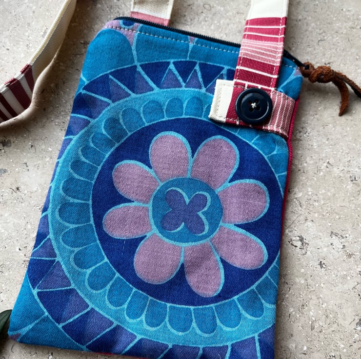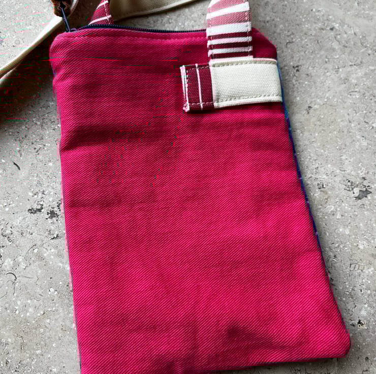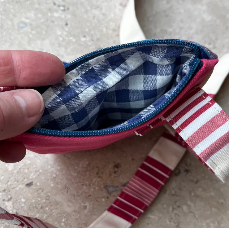 Small lightweight zip pouch on a long strap to carry phone or keys. The front is a scrap of reclaimed Bernard Wardle vintage curtain fabric and the back is bright pink fabric taken from a sample swatch. Lined with navy gingham.
