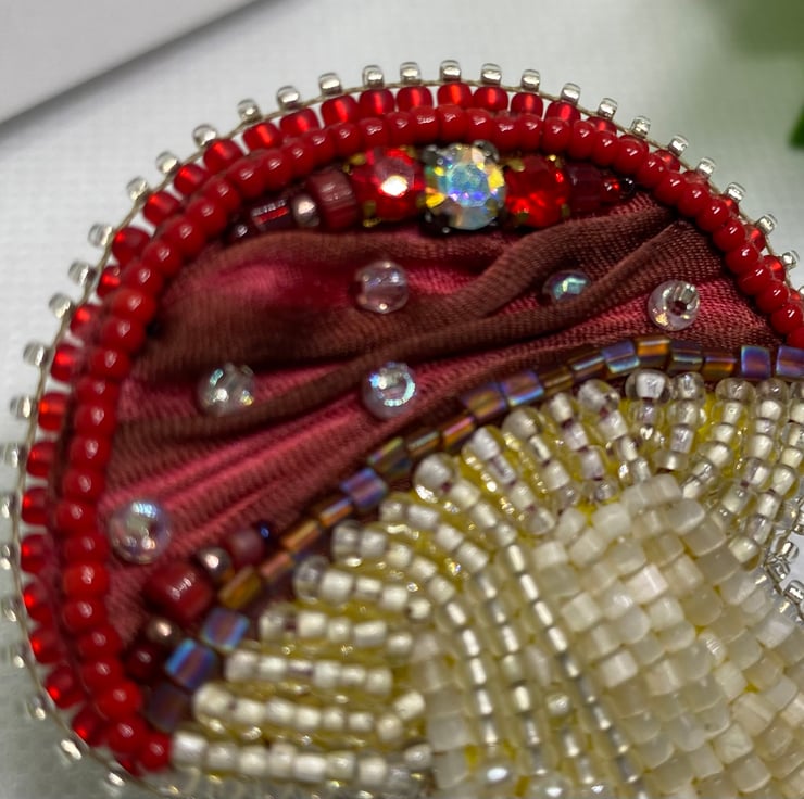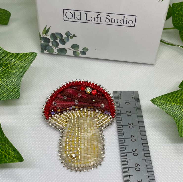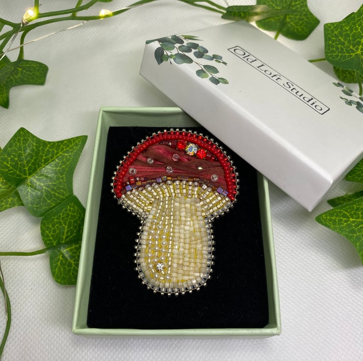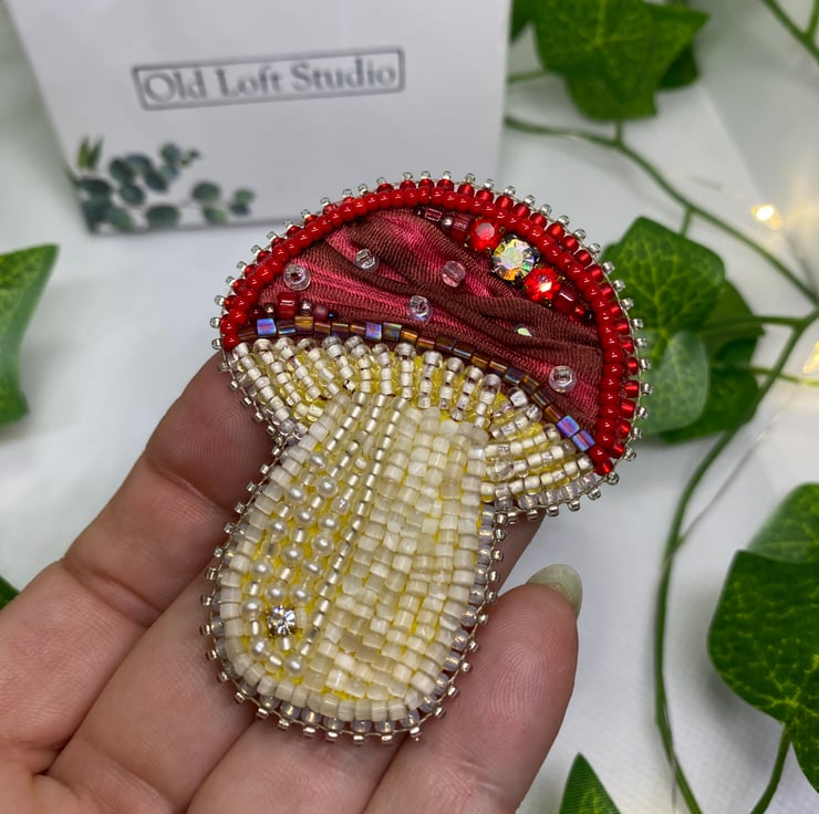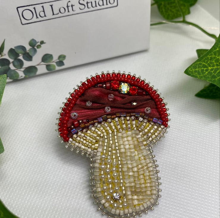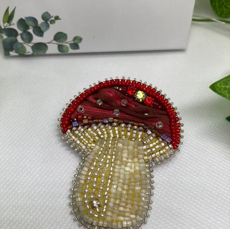 Pretty hand beaded toadstool mushroom Brooch. Made using glass seed beads, vintage rose montees and gorgeous Shibori silk ribbon.
