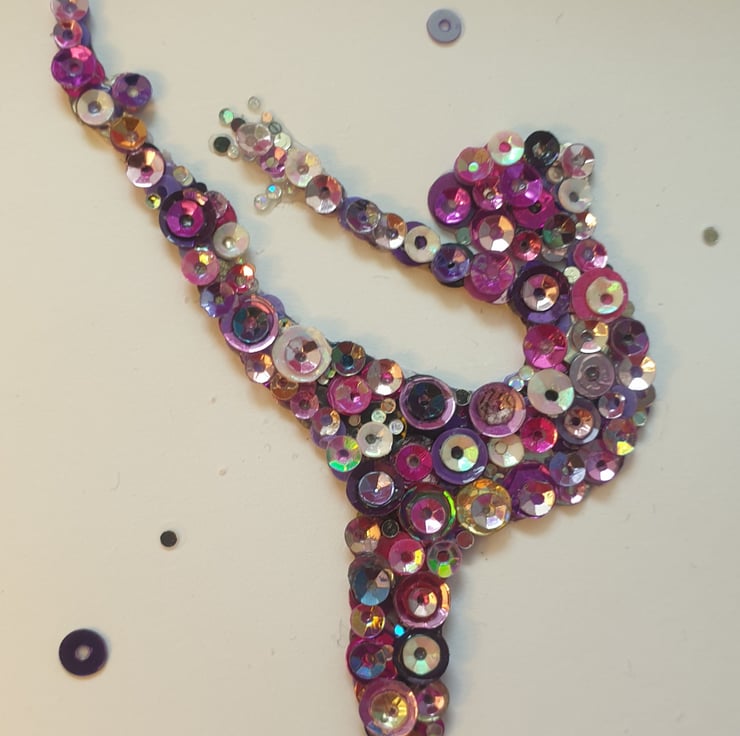 This unique, one-of-a-kind card is handmade by me with much love and attention to the intricate sparkly details. The multicoloured sequins are placed and layered one at a time and then lacquer-sealed to keep them looking their shiny best. Colours include shades of pink, purple, silver, gold and white. The process can take up to two full days to complete, depending on the design of the card.