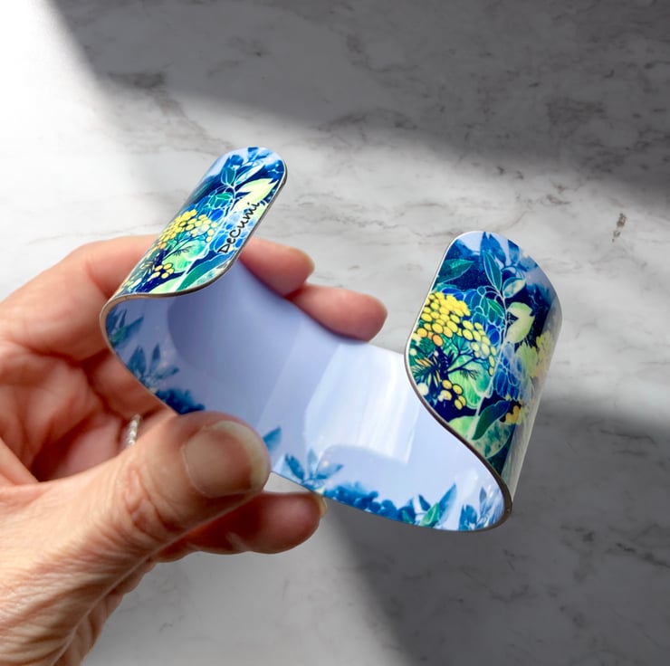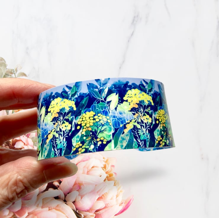 Sale cuff bracelet with a blue and yellow floral design. This item is in perfect condition and is reduced because it is a discontinued design.