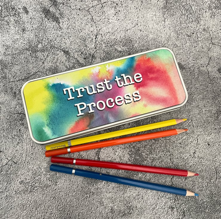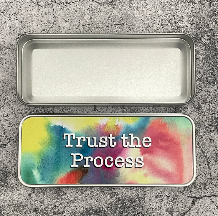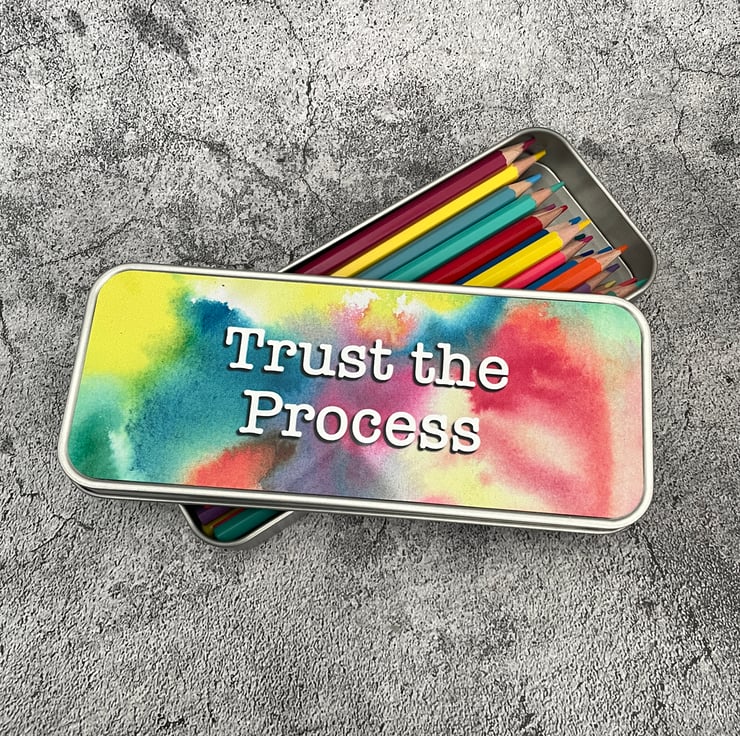 This listing is for a metal pencil tin printed with a colourful watercolour background and the motivational motto "Trust the Process" for those times when you need a little reminder!