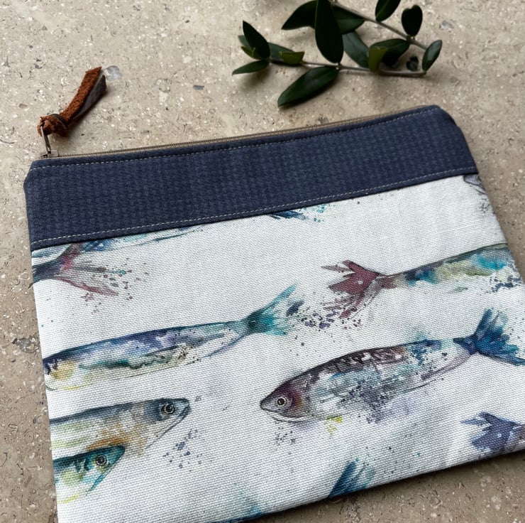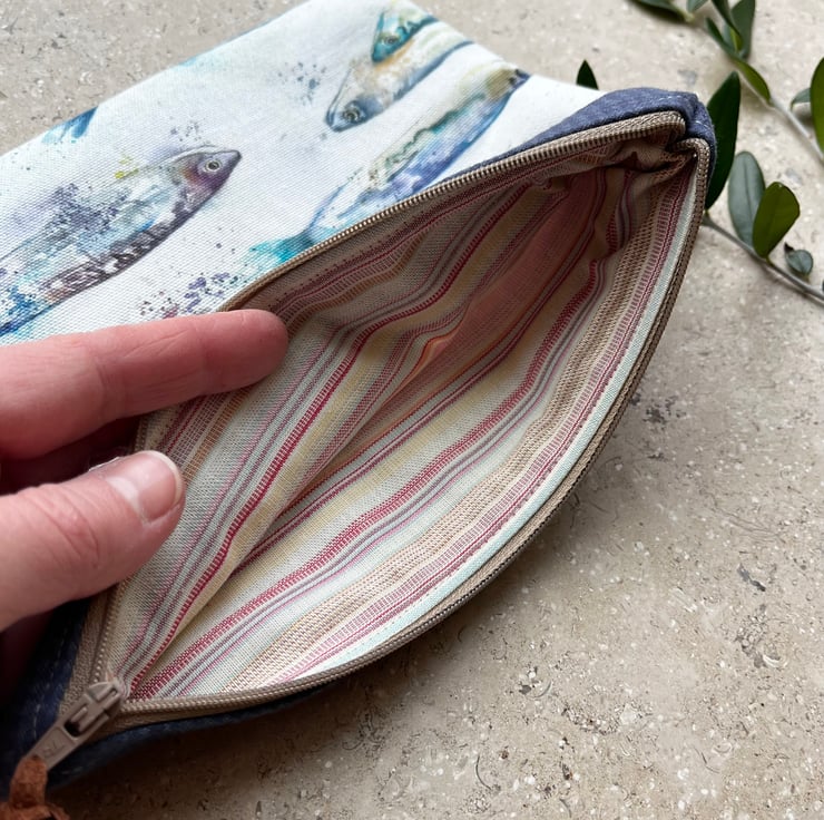 This cute zip pouch is made from colourful watercolour fish fabric and a soft blue sample swatch. It is fully lined with colourful striped cotton. It is perfect for organising small bits and pieces, as a pencil case or makeup bag.