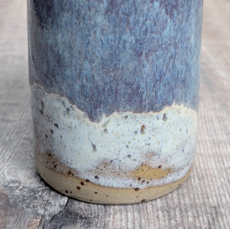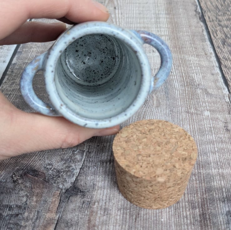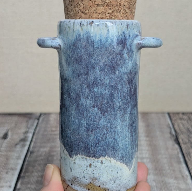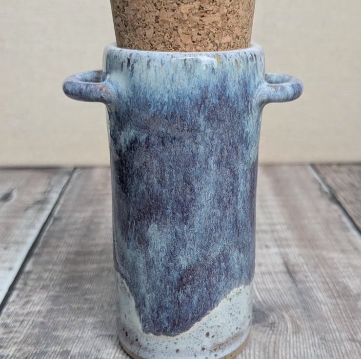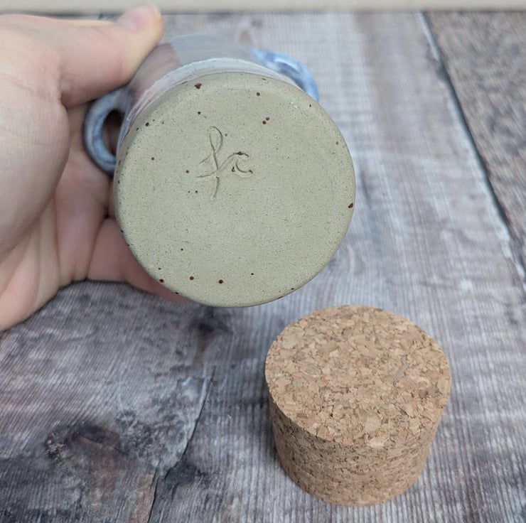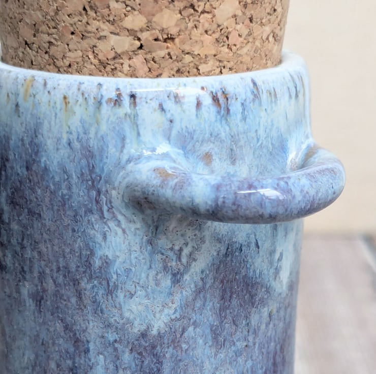 This pot is thrown from a speckled stoneware clay on the pottery wheel and two hand built handles on either side. There is a lovely tonal white glaze all over with purple/blue shades added on the outside. A quality cork lid is supplied.