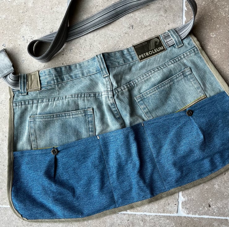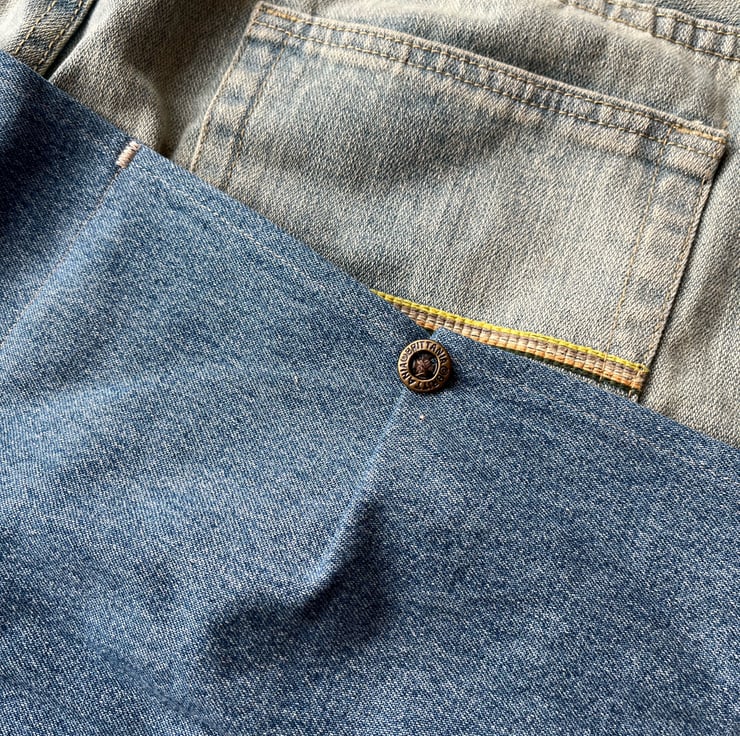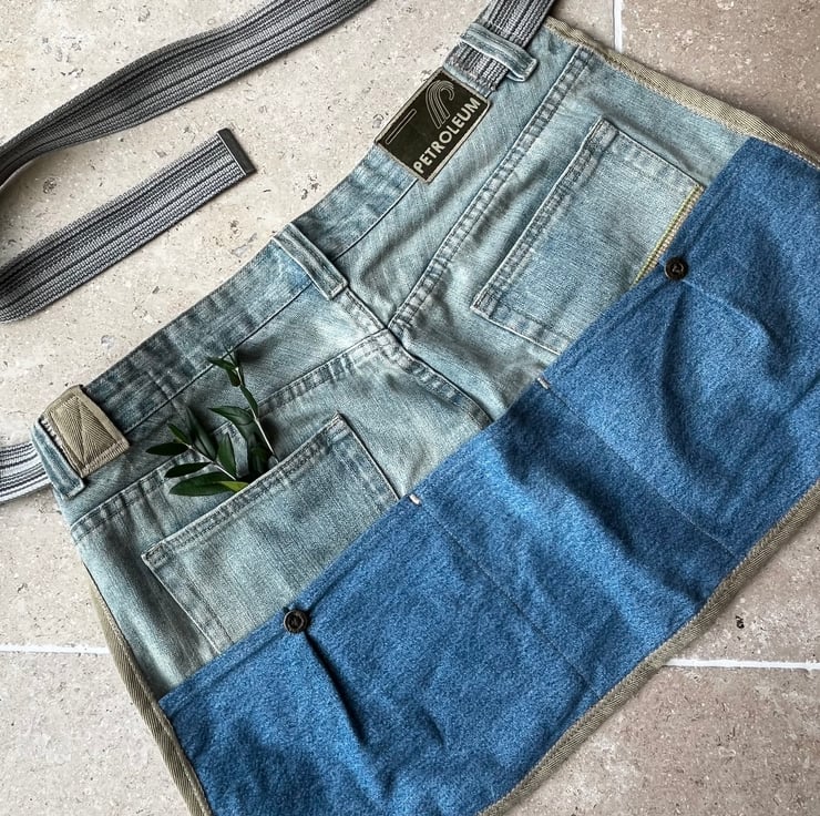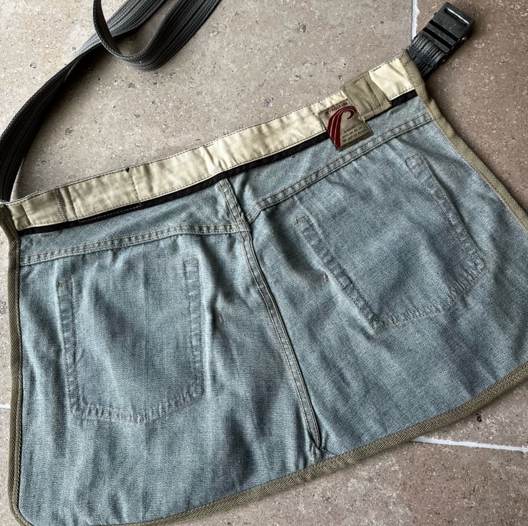 one of a kind apron made from the back of a pair of jeans and reclaimed lightweight denim. There are two pockets from the back of the jeans and three more pockets from the lighter weight denim